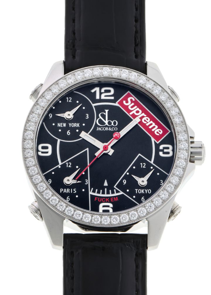 ジェイコブ × シュプリーム - ファイブタイムゾーン シュプリーム | JACOB&CO × SUPREME | FZ200.10.AA.AAA | SS 黒文字盤 クォーツ レザー | 中古
