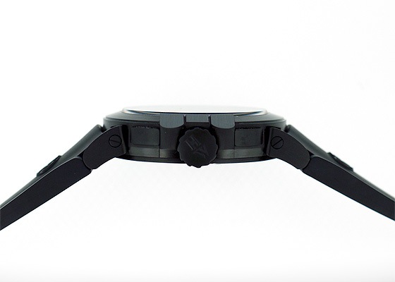 スポーティな44mmケースにおさめられた2つのデュアルタイムとナイト&デイ表示が特徴的な「オーシャン デュアルタイム」。こちらのモデルはケース素材のザリウムにDLCコーティングを施した、精悍な印象のオールブラックタイプ。