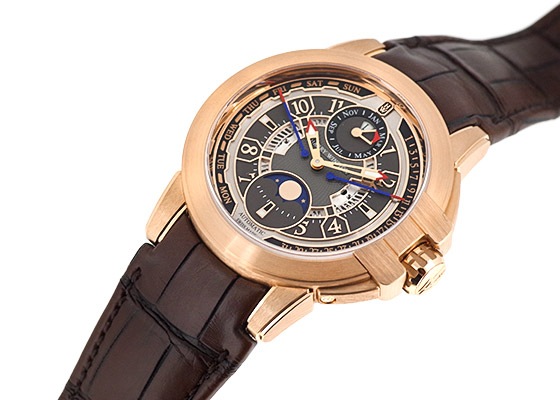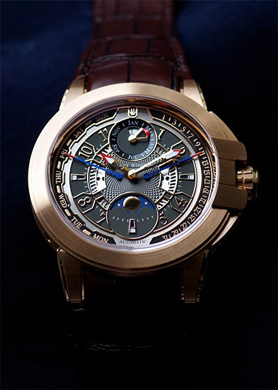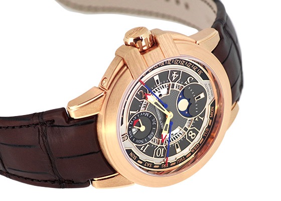 オーシャン バイレトログラード パーペチュアルカレンダー オートマティック 2018年の新作、オーシャンコレクション20周年を記念した「オーシャン・バイレトログラード パーペチュアルカレンダー オートマティック 42mm」 日付と曜日の表示には、ブランドが得意とするレトログラード式を採用。文字盤9時側が曜日表示となり、針が上昇しながら示す。3時側が日付でこちらは下降しながら日付を表示する。それぞれが周期を終えるとMON、1の位置に瞬間的に戻り再び動き出す。 オーシャンコレクション、Zシリーズに見られる建築学的、幾何学的な要素を取り入れ力強さを表現しつつも、様々な機能表示を同心円状に配置し優れた視認性を確保。技術・力強さを絶妙なバランスで演出し20周年の節目にふさわしい特別なタイムピースです。 搭載機能 時・分、レトログラード式日付表示、レトログラード式曜日表示、閏年表示、ムーンフェイズ 72時間パワーリザーブ
