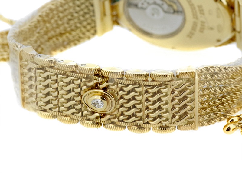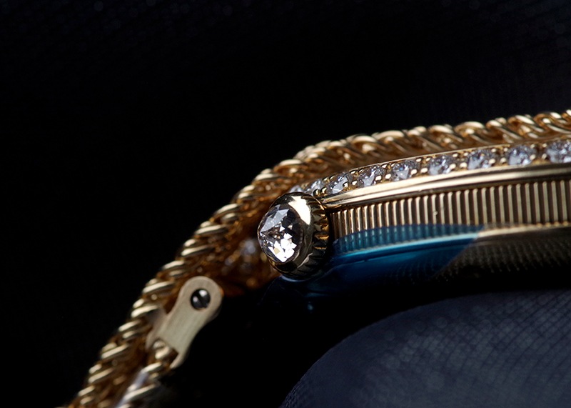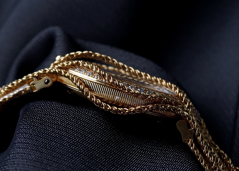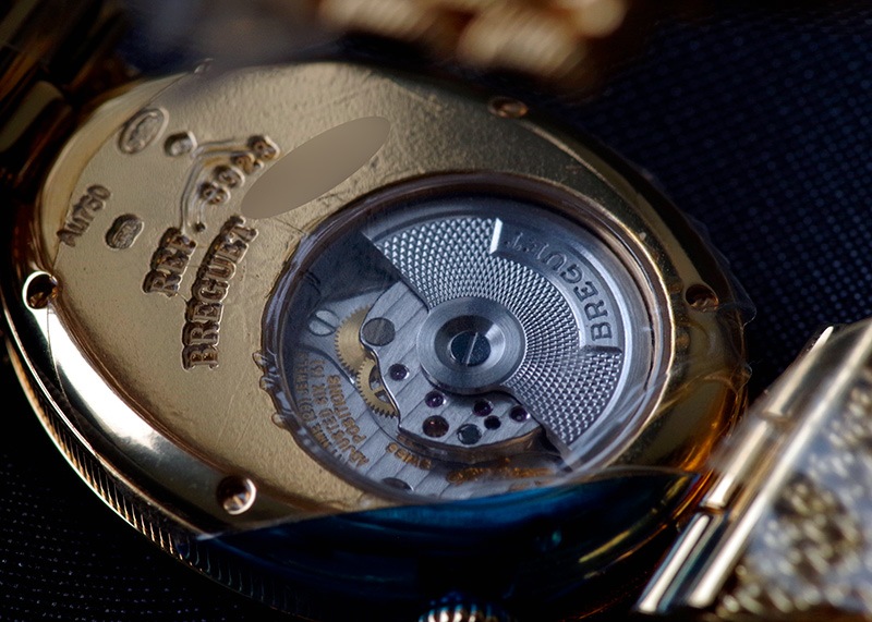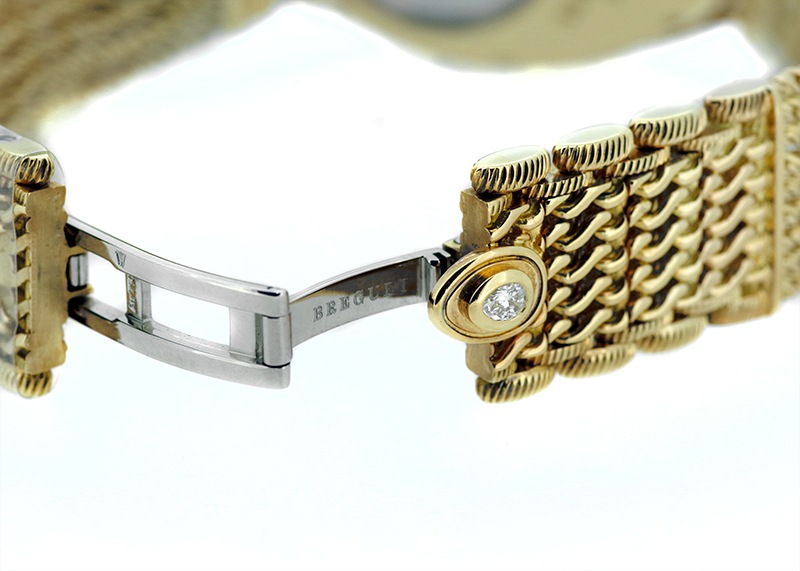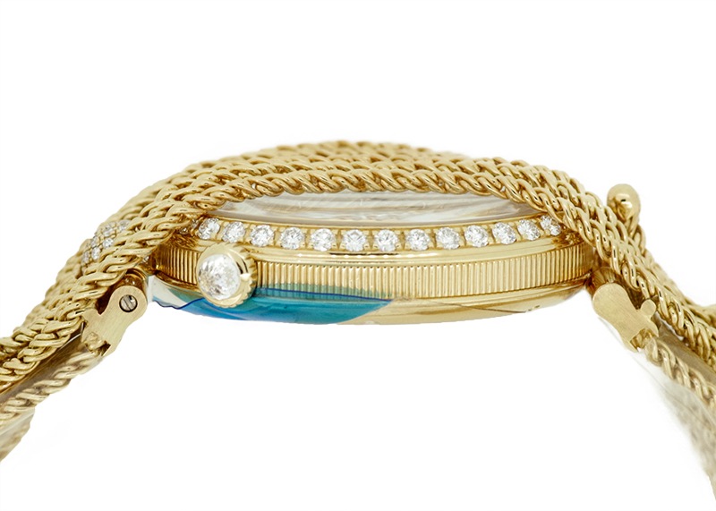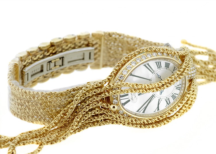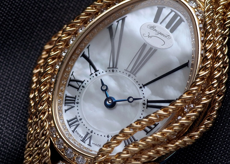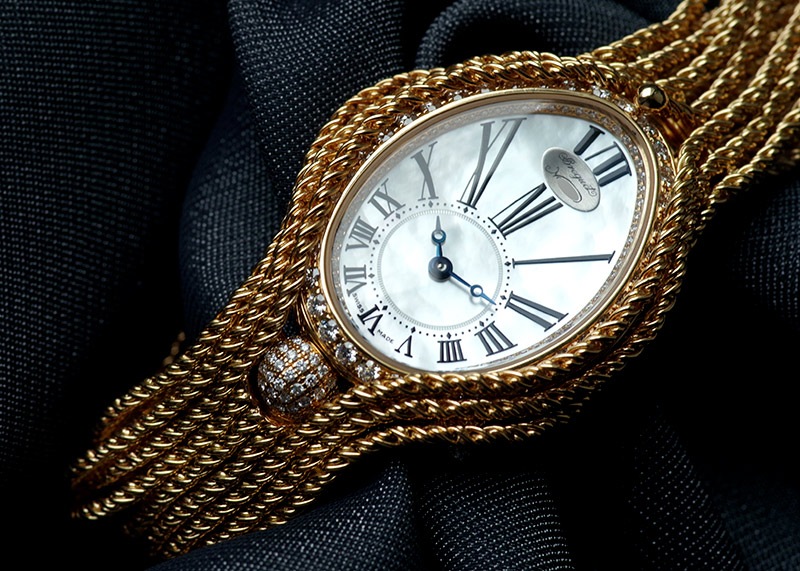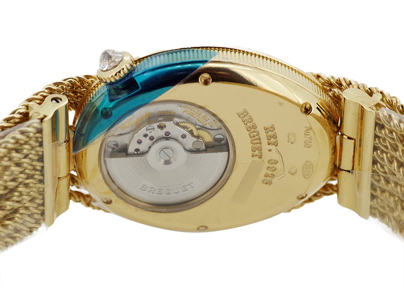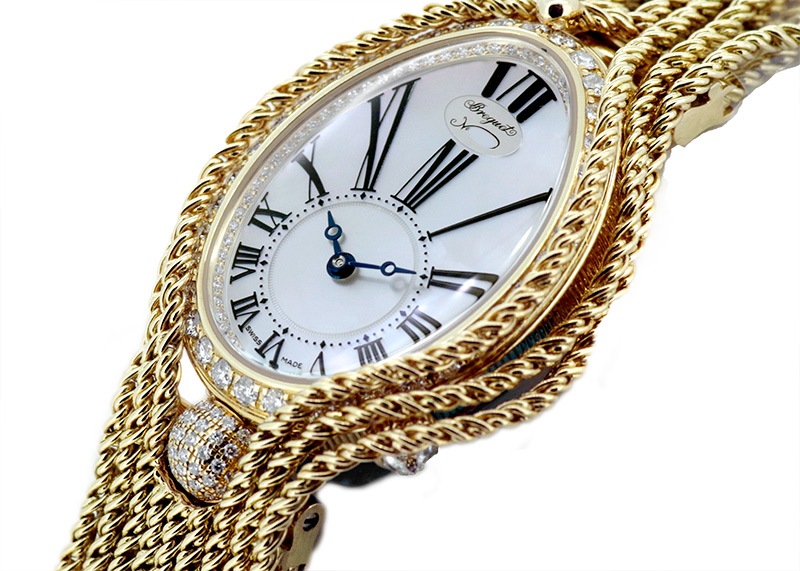 ブレゲ「クイーン・オブ・ネイプルズ ミニ8928」 ブレゲの創始者、アブラアン・ルイ・ブレゲがナポレオンの妹、ナポリ王妃のために創作した初期のブレスレットウォッチをベースとするジェリーウォッチコレクション。 他のブランドではジュエリーウォッチに使用するのはクォーツが定石となっているなか、 33mmの卵型の小さなケースに高精度の自動巻きムーブメントを搭載し、機械式時計として見ても超一級品。 ブレゲの唯一の女性用ラインナップクイーンオブネイプルズのコレクション。 文字盤はマザーオブパールを使い、角度によって豊かな表情を魅せてくれます。 またベゼルには139個、約1.32カラットものダイヤモンドセッテングし、18Kイエローゴールドのブレスレットと相まって、貴方の腕元を綺羅びやかに演出します。 非常に個体の少ない腕時計、ぜひ一度お手に取って御覧ください。