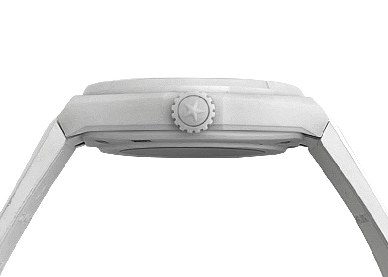 ゼニスより、「デファイ クラシック」が入荷いたしました。 1865年に創業、驚異的なハイビートムーブメント「エルプリメロ」を開発した超一流ムーブメントを製造するメーカーとしても有名なゼニス。 エルプリメロはクロノグラフの名機と名高いですが、同じくゼニスの誇る名機として薄型3針ムーブメント「エリート」があります。 デファイ クラシックが搭載する「Elite 670 SK」は、部品の一部にシリコン素材を用いることで摩擦を減らし、かつ高い耐磁性能を実現。 スマートフォンやパソコンなど常に磁気の影響にさらされている現代の使用においてとても魅力的です。 また、スケルトンで表裏ともに名機エリートを見られるのはデファイ クラシックならでは。 シンボルマークの星が至る所にデザインされ見た目にも美しいムーブメントです。 ファセットカットが多用された幾何学的で複雑なケース形状を、加工が難しいとされる硬質なセラミックで作り出すのもゼニスの技術力。 このホワイトセラミックモデルは2019年に発表され、硬質でありながら明るく爽やかな雰囲気が魅力。 ラバーストラップも白のオールホワイト。41mmのサイズ感と薄さも相まって これからの季節ににさらっと身に着けるのにとてもお洒落です。 商品状態は セラミック・ラバー部分ともに擦れ跡なども無く、非常にきれいな状態です。 付属品は箱・国際保証書(OPEN)がございます。 *生産終了品 参考定価¥924,000(税込) さらに詳しい内容を確認されたい方は、お気軽にお問い合せ下さい。 管理用:owk017