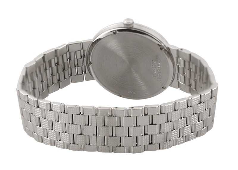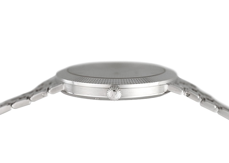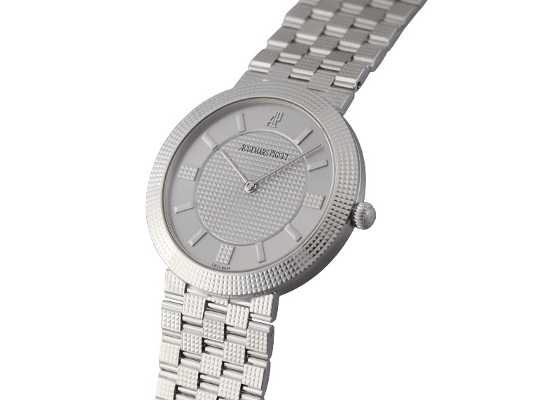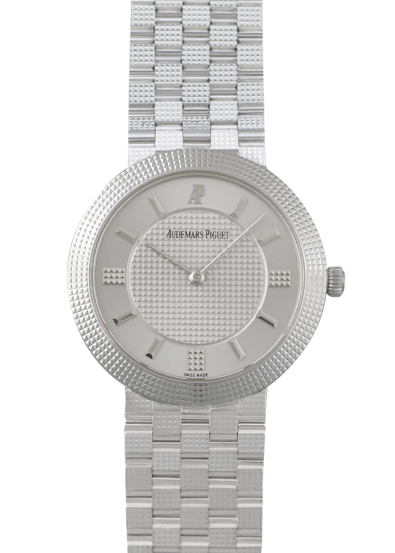 誕生以来一度も創業家一族の手を離れたことのない最も歴史の長い時計メーカー名門マニュファクチュール『オーデマピゲ』。 「ロイヤルオーク」が代表的ですが、小振りで繊細なドレスウォッチの製造も手掛けています。 こちらは、クル・ド・パリがベゼル・ブレスレット・文字盤・インデックスに施された珍しいモデルです。 全て手作業で彫金された形状はあらゆる角度からの光を反射し、美しく輝きます。 ケースとブレスレットが一体になっており、クラシックな雰囲気を演出できます。 提携工房にてオーバーホール(分解掃除)、外観の傷取り(研磨)が完了しています。 腕周りは約17センチまで対応します。 付属品はございませんが、当店の携帯ケースをお付けします。 USED品は個体により状態が異なりますので、さらに詳しい内容を確認されたい方は、お気軽にお問い合せ下さい。 管理用:owm423