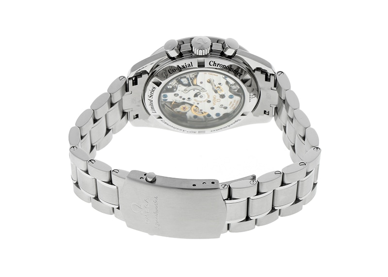 スピードマスターの限定モデルが入荷をしました。 オメガを代表するコレクションアイテムです。 スピードマスターが誕生をして半世紀。 2007年に50年周年を記念してムーンウォッチの限定品が登場しました。 数々のミッションをこなした伝説のクロノグラフはさらに進化をしました。 1957本限定のこちらのモデルは、ブラックエナメルの文字盤が特徴で、限定の固有番号がプリントされています。 ムーブメントはフレデリックピゲ製の手巻式コーアクシャルキャリバー3201を搭載、パワーリザーブは55時間。 美しい機構、動きをシースルーバックの裏蓋から観賞することができます。 2022年10月にオメガにてコンプリートメンテナンスサービス(分解掃除)をおこなっています。 また2024年2月にオメガにてベーシックパーシャルサービス(精度調整)をおこないました。 時計の外観は当たり傷など無く、綺麗な状態です。 表面のガラスに肉眼での判別しにくい程度の小傷がみられます。 オメガの専用箱、保証書、限定証明書、レザーストラップ、バックル、NATOベルト、工具一式が付属をします。 2011年2月に販売がされた商品で、内箱には経年劣化がみられますのでご了承ください。 腕周りは約19cmの方まで対応します。 今後も未知の領域へ挑戦をするスピードマスターからは目が離せません。 さらに詳しい内容を確認されたい方はお気軽にお問い合せ下さい。 管理用:own514