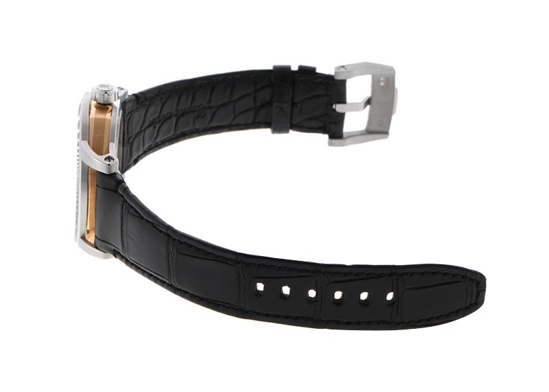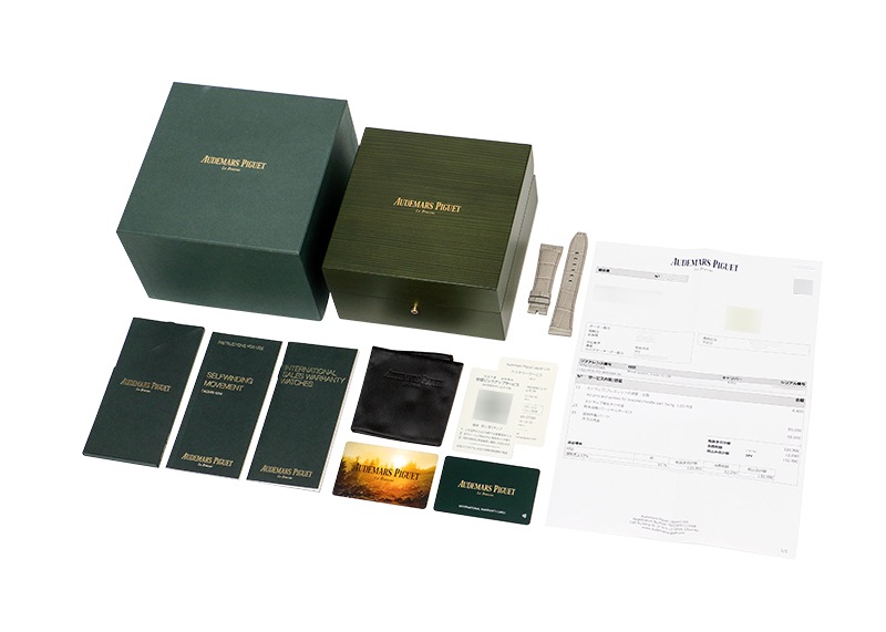 名門マニュファクチュールのオーデマ・ピゲより「CODE11.59 by オーデマピゲ」が入荷しました。 誕生以来一度も創業家族の手を離れたことのない最も歴史の長い時計メーカーのオーデマ・ピゲ。 長い歴史と伝統から成る確かな技術をもって 2019年新ライン 「CODE 11.59 バイ オーデマ ピゲ」 を発表しました。 モデル名の由来は C=挑戦、O=伝統・歴史、D=理念、E=進化、そして11.59は新しい一日が始まる直前を意味し、新たな一日を創造するたゆまぬ進化と情熱の意味が込められています。 特徴である風防のサファイアガラスは特殊な構造をしており、中心を軸に12-6時方向にアーチ型の表面とドーム状の裏面で形成されています。 この二方向の異なる二つの曲線が、今までにない斬新な視覚効果を生みだしています。 オープンワークのラグから覗く八角形のミドルケースと、ロイヤルオーク仕様のラグネジはオーデマピゲの理念でもある伝統の継承。 伝統と革新を併せ持つディテールとなっています。 もう一つの特徴、ケースデザインの斬新さと美しさが際立つのが今回入荷したコンビ素材です。 構造としては、極めて細く作られたラウンド型のベゼルとラグに、ミドルケースがサンドイッチされていることと、さらにそのミドルケースがロイヤルオークなどオーデマピゲのアイデンティティである八角形をしていることがこのモデルの特徴です。 コンビ素材の場合、ミドルケースのみピンクゴールドのため、そのサンド構造と八角形の形が単一素材より一層美しく引き立ちます。 正面から見るとホワイトゴールドのラウンドに見えるのに、少し斜めにしたとたん目に入るピンクゴールドが斬新でとてもお洒落です。 ムーブメントはロイヤルオーク 15500にも搭載されるキャリバー4302。 オーデマピゲの基本の3針ムーブメントの最新型で、パワーリザーブは約70時間を誇ります。 ケースとラグに僅かな擦り傷が見られます。 ストラップは純正新品ベルトを取り付けています。 2024年3月にオーデマピゲにて点検、ラグネジ交換、ガラス交換をおこなっています。 オーデマピゲの箱、保証書(2022年1月販売)が付属をして、2027年1月まで保証期間が延長されています。 さらに詳しい内容を確認されたい方は、お気軽にお問い合せ下さい。 管理用:own599