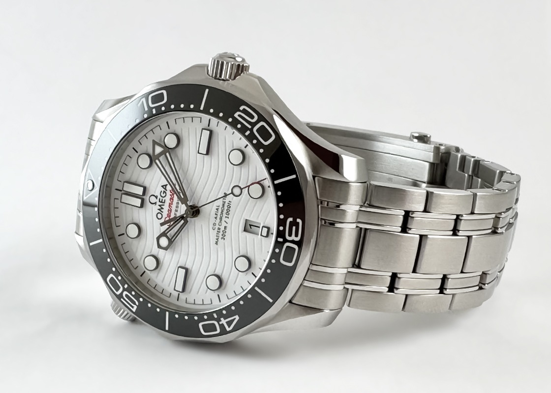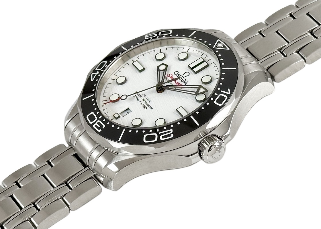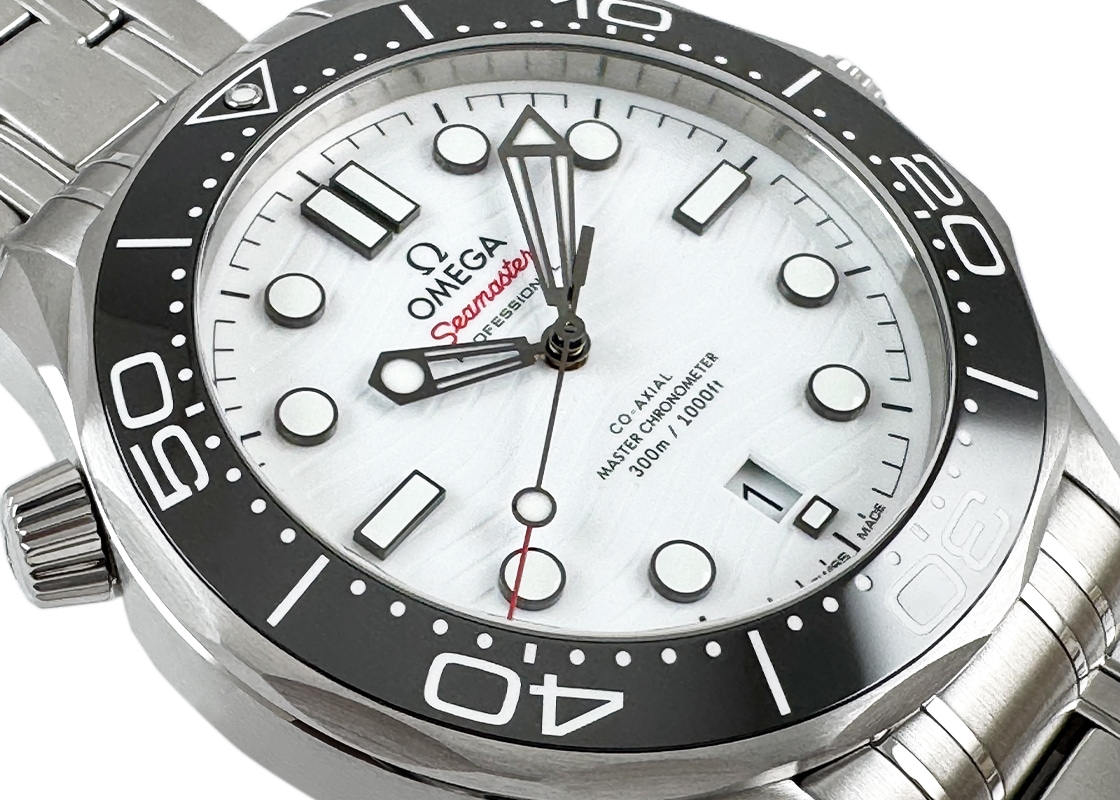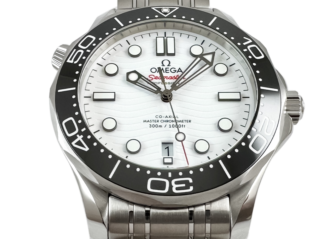 オメガより「シーマスター ダイバー 300m」が入荷いたしました。 1993年に逆回転防止ベゼル、ヘリウムエスケープバルブを搭載したプロ仕様のダイバーウォッチとして「シーマスタープロフェッショナル 300」が登場します。 このファーストモデルは人気映画「007」のジェームズ・ボンドが着用したことでも有名です。 こちらのモデルは25周年を迎えた2018年発表され、文字盤デザインとムーブメントをアップデートしました。 文字盤はセラミック製を採用しています。 レーザーエングレービングによる波模様とホワイトカラーはとても発色が良く、肉抜きされた針と高さのあるアプライドインデックスにはたっぷりの夜光が盛られているため暗いところでの視認性も抜群です。 ホワイトエナメルでダイビングスケールが刻まれたベゼルもセラミック製を採用しており、モノトーンカラーは日常使いしやすく、文字盤とのコントラストが効いていて爽やかな印象です。 ムーブメントは、パワーリザーブ55時間のCal.8800を搭載。 両方向巻き上げやシリコン製フリースプラングテンプを採用したMETAS認定のマスタークロノメーター仕様で、精度・耐久性・耐磁性は申し分ありません。 シースルーバックからは美しいアラベスク模様のコーアクシャルムーブメントをご覧いただけます。 またダイバーズ用のフォールディングクラスプは、エクステンションパーツで腕周りの微調整が可能です。 商品状態は、当店入荷後に外装仕上げ済みの綺麗な個体です。 ブレスレットはフル駒で約19.5cmの腕周りまで対応可能です。 付属品は、箱・保証書(OPEN)がございます。 さらに詳しい内容を確認されたい方は、お気軽にお問い合せ下さい。 管理用:owp121