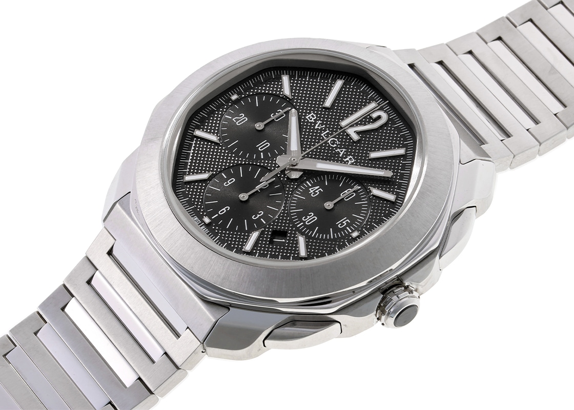 ブルガリの「オクト ローマ」が入荷しました。 ブルガリは、永遠の都市ローマを象徴するイタリアの代表的なジュエラーであると同時に、現在ではスイスでも屈指の技術力を誇る高級時計のマニュファクチュールです。 2000年に高級時計メゾンである「ジェラルド・ジェンタ」「ダニエル・ロート」を傘下におさめたことが、ブルガリの技術力を飛躍させる契機となりました。 「オクト」は、傘下におさめた「ジェラルド・ジェンタ」から登場した「ジェラルド・ジェンタ オクト」をブルガリが再構築し、そのDNAを受け継いだコレクションとなっております。 オクトとは八角形を意味し、調和と完璧さを象徴する古代のシンボルです。 ローマのインスピレーション、イタリアのデザイン、そしてスイスの時計製造技術が融合した現代的なスタイルの象徴的モデルであり、ブルガリのアイコンと呼ぶに相応しいモデルです。 こちらは自動巻きのクロノグラフです。 洗練されたクルドパリ仕上げのブラックダイアルは直感的にクロノグラフを読み取ることができます。 サテン仕上げとポリッシュ仕上げを施した42mmのステンレススティール製ケースと、同仕上げのブレスレットは大変手間の掛かる構造であり、その仕上げの技術はジュエラーとしてのブルガリの高い技術が証明されています。 ムーブメントは自社製キャリバー BVL399、パワーリザーブは42時間、100m防水です。 提携工房にて外装の傷取り(研磨)をおこなった後に、ブルガリにてベーシックサ-ビス(機械点検、調整、防水検査)をおこなっています。 ベゼルの10時位置、2時位置のラグに取りきれない傷がみられます。 2023年6月に販売がされた商品で、ブルガリの箱(外箱に破れあり、内箱は壊れあり)、保証書、未使用の交換用のストラップ・尾錠が付属します。 腕周りは約17.5cmの方まで対応します。 さらに詳しい内容を確認されたい方はお問い合わせください。 管理用:owp283