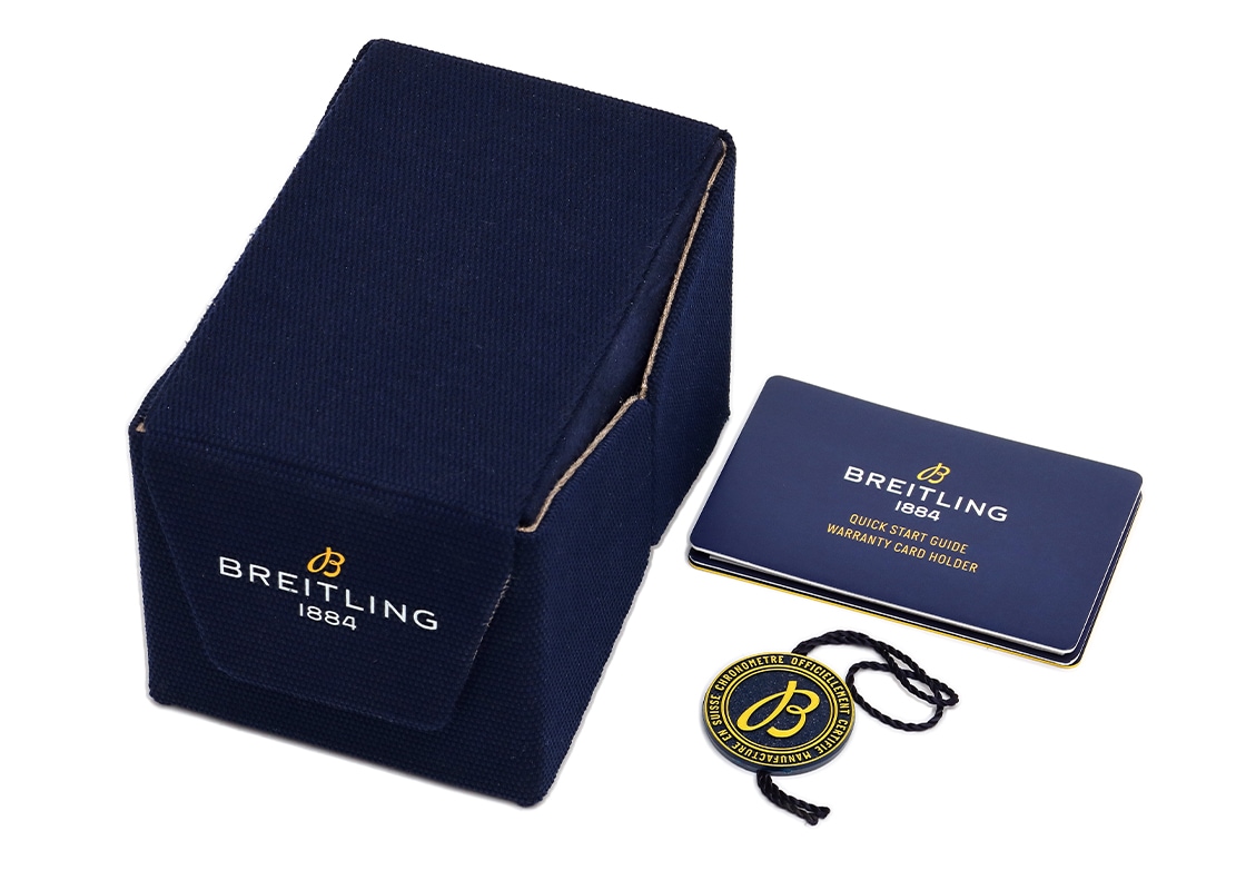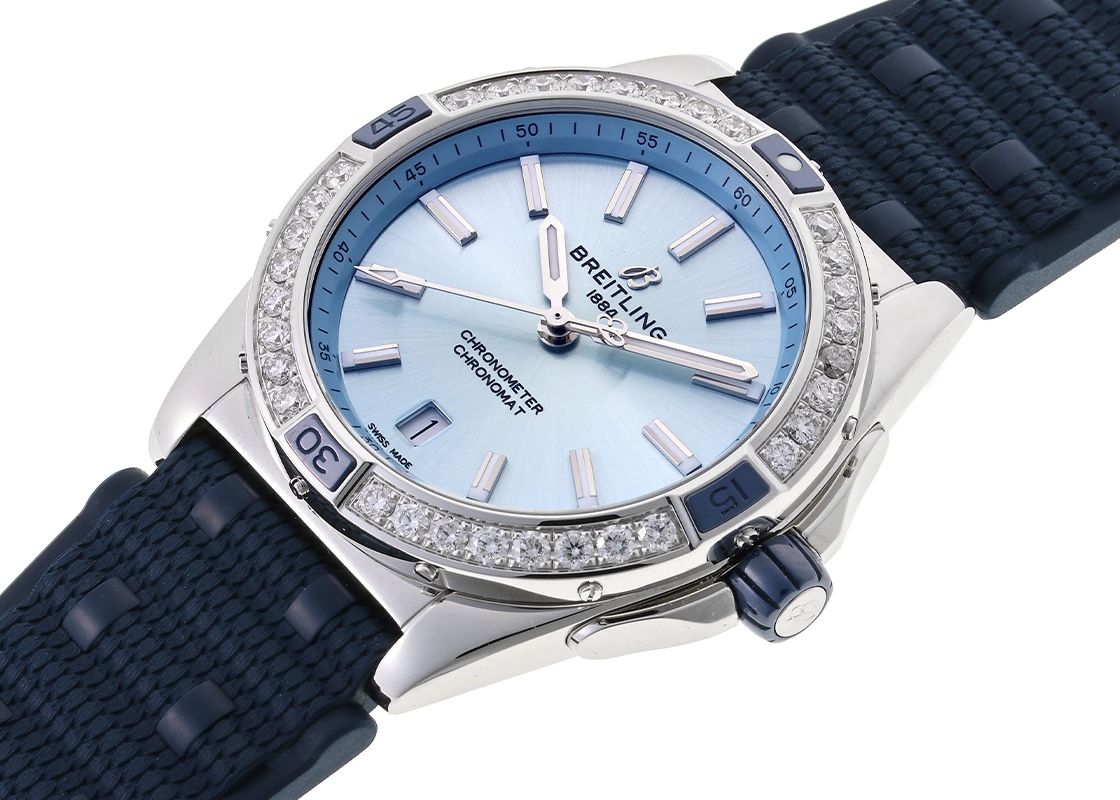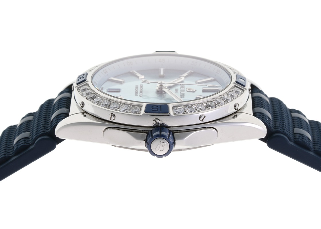 ブライトリングより「スーパークロノマット オートマチック 38」が入荷しました。 1980年代にブライトリングがイタリア空軍のために製作したオリジナルのクロノマットにインスパイアされた「スーパークロノマット」。 ベゼルの4か所に設置されたライダータブとリューズにはセラミックを採用し、艶やかな質感と傷つきにくさ、耐食性を兼ね備えています。 こちらのモデルは、ベゼルに合計32個のダイヤモンドを配し、ポリッシュ加工が施されたケースやアイスブルーカラーの文字盤と相まって、とても爽やかで煌びやかな印象です。 ストラップは、このモデルの特徴である弾丸をつなげたようなデザインの「ルーロー・ブレスレット」を模したラバーベルトを取付けております。 モデル番号は本来ブレスレットの仕様ですが、ブレスレットは欠品しております。 38ミリのケースに納められるのは、自動巻きキャリバー「ブライトリング17」。 6時位置にデイト表示を備え、パワーリザーブは約38時間です。 提携工房にて機械点検と外装の傷取り(研磨)が完了しており、非常に綺麗な状態です。 ブライトリングの箱(枕欠品)と保証書(2022年11月販売)が付属します。 さらに詳しい内容を確認されたい方は、お気軽にお問い合せください。 管理用:owp409