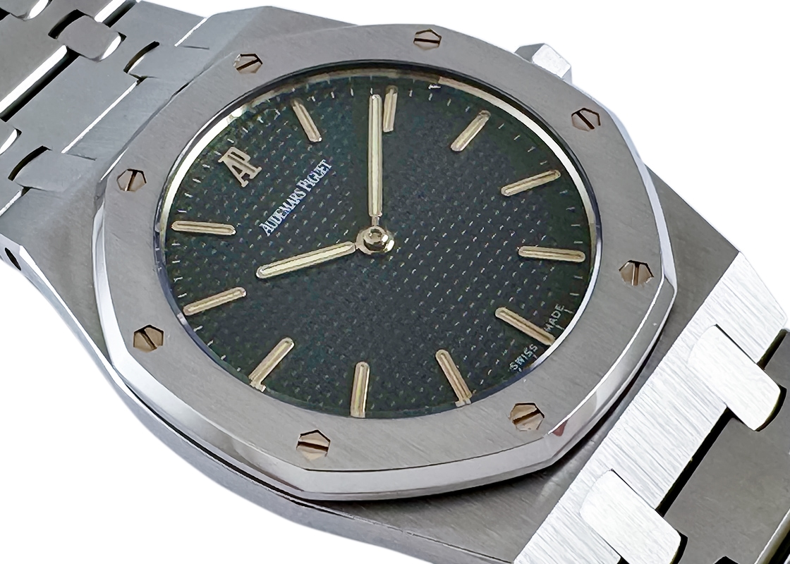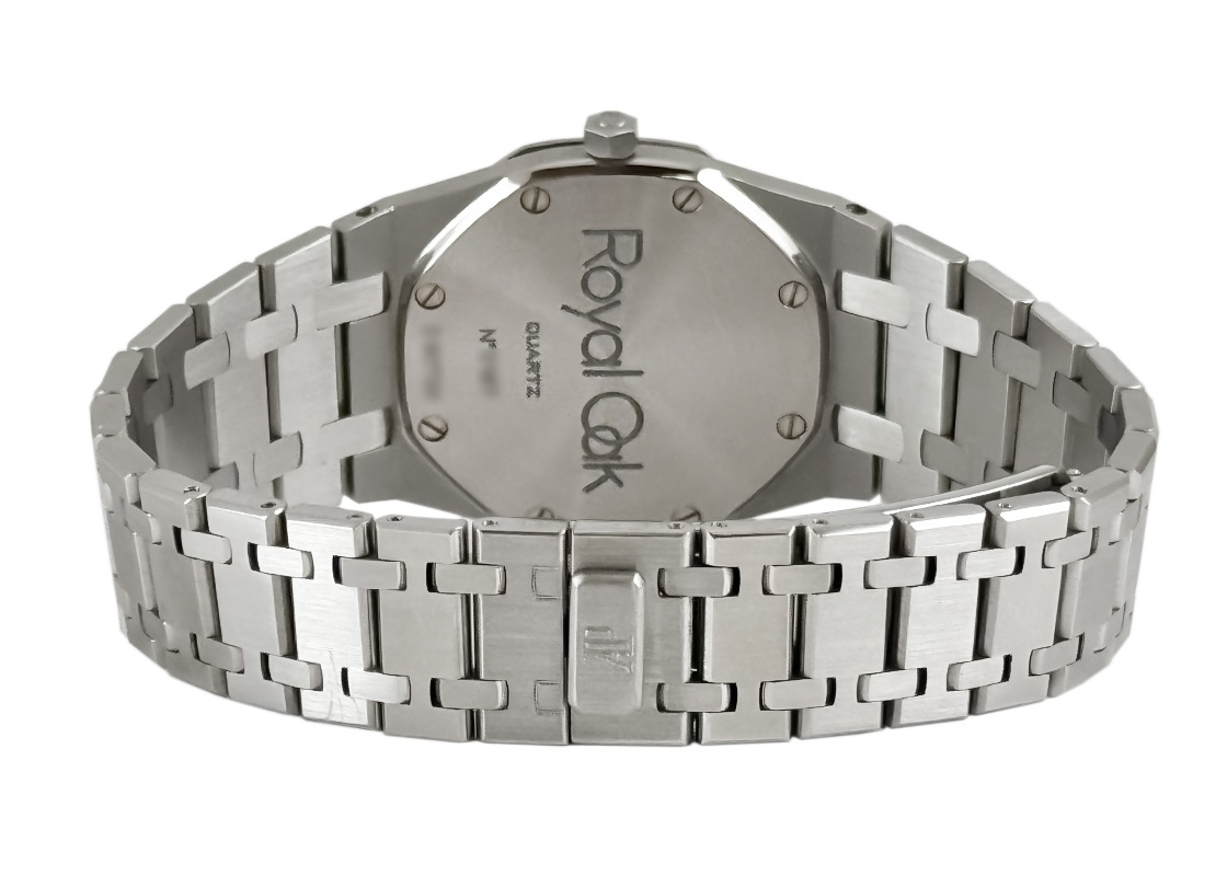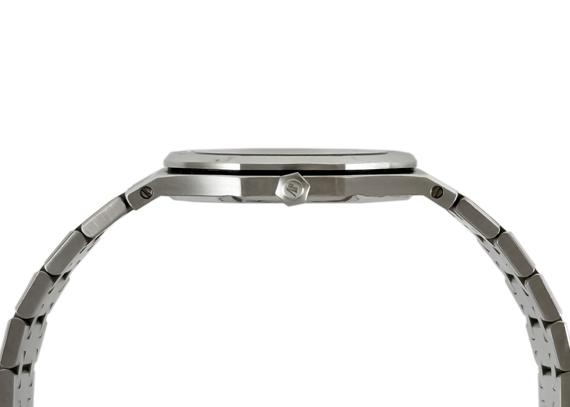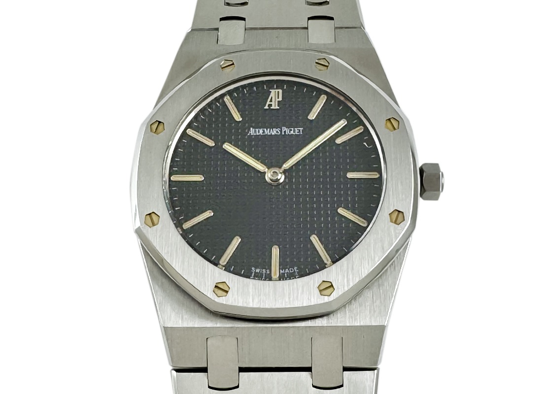 名門マニュファクチュールのオーデマ・ピゲより、「ロイヤルオーク」が入荷しました。 時計界の天才デザイナーであるジェラルド・ジェンタ氏によって1972年に誕生した「ロイヤルオーク」。 高級感とスポーティー要素を兼ね揃えたラグジュアリースポーツの原点でもあり、その人気は現在まで続いています。 今回入荷したのはユニセックスにお使いいただける33mmのケースサイズです。 90年代当時は~35mm以下がメンズサイズの主流でしたので、現行モデルが大きすぎる方にもお薦めです。 八角形のベゼルと8つのビス、ケース・ラグ一体型のブレスレットが特徴で、タペストリー文字盤が光の加減で黒色から濃紺色にも表情が変わります。 日付のないシンプルな2針がよりモデルを惹き立て、バーインデックスと針に施されている夜光により視認性が確保されています。 商品状態は 使用による僅かな擦れは見られるものの、ベゼルのエッジも残っており良いイメージの個体です。 また、ブレスレットの駒もしっかり残っている点もプラスポイント。腕回り18cmまで対応可能です。 付属品は箱・保証書(1998年12月)・修理明細書(2024年4月)がございます。 さらに詳しい内容を確認されたい方は、お気軽にお問い合せ下さい。 管理用:ii-596