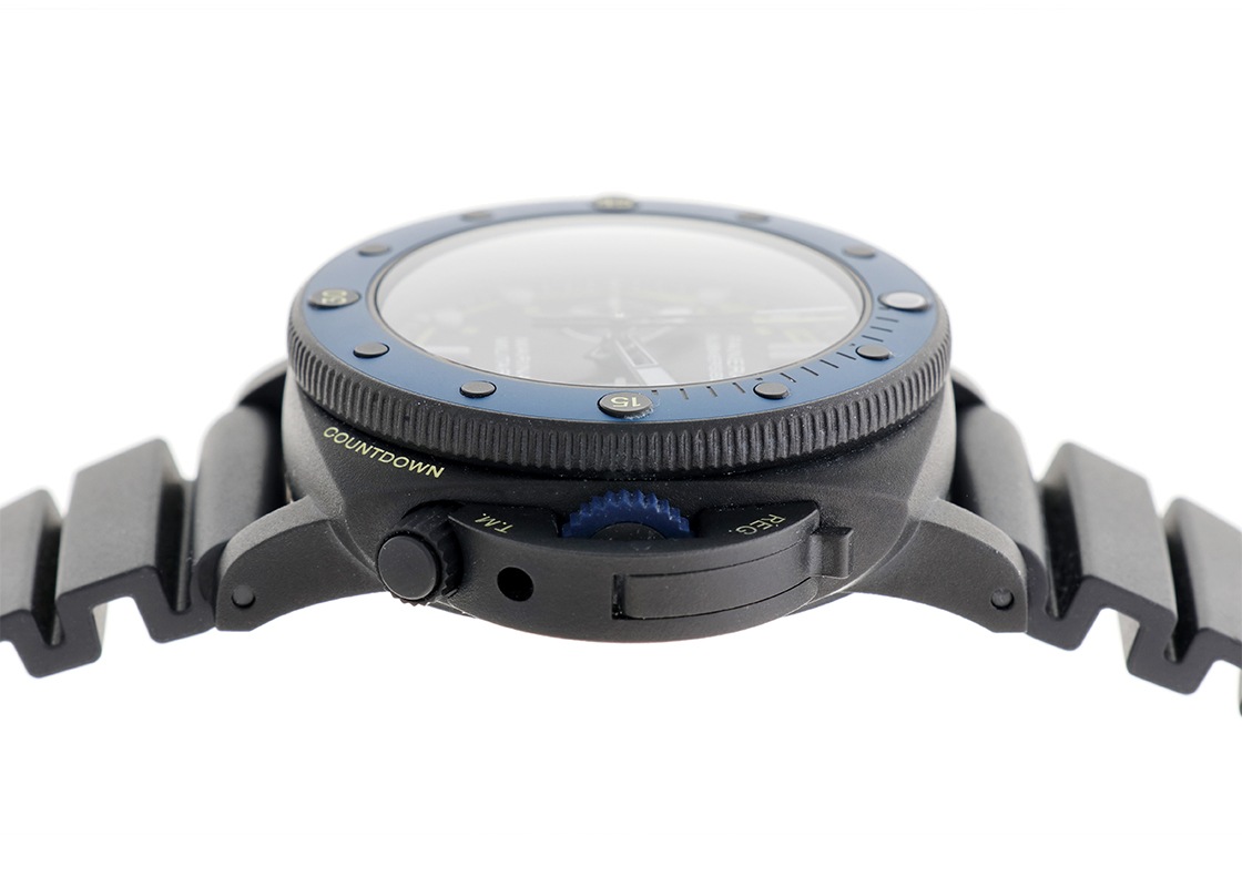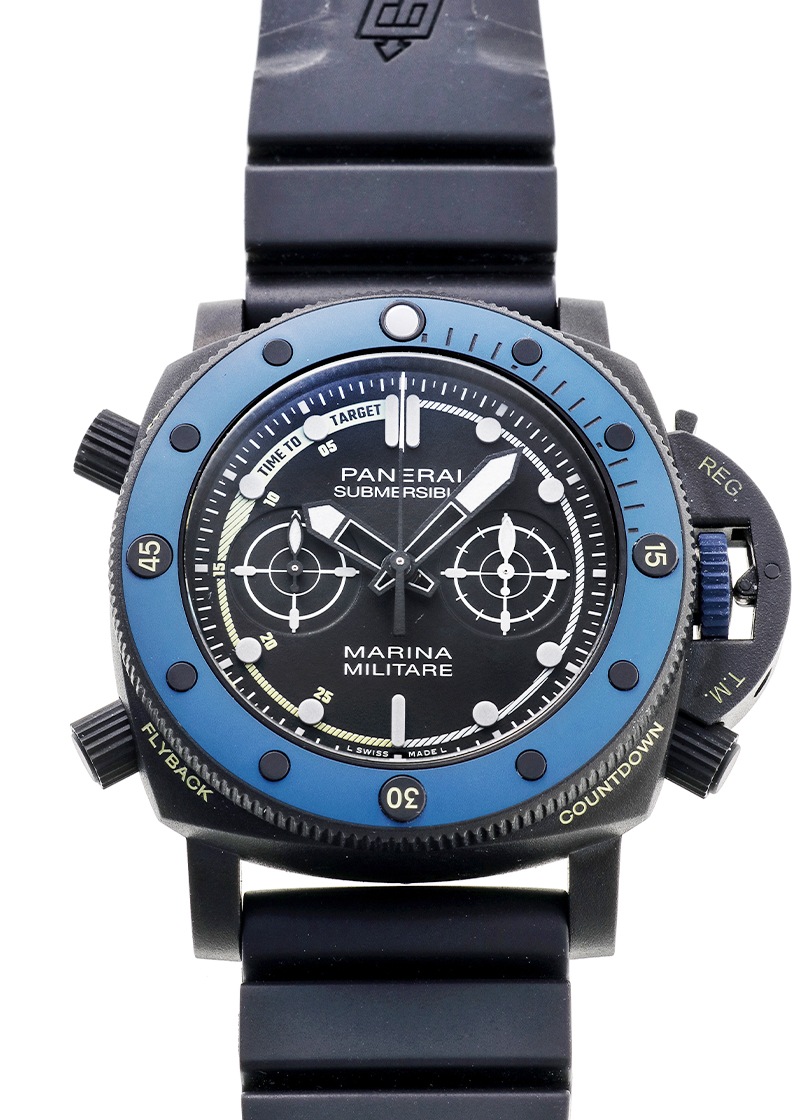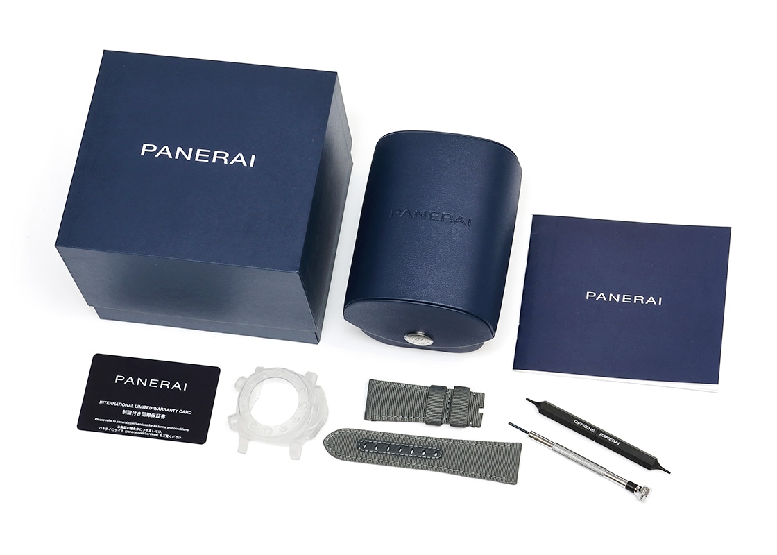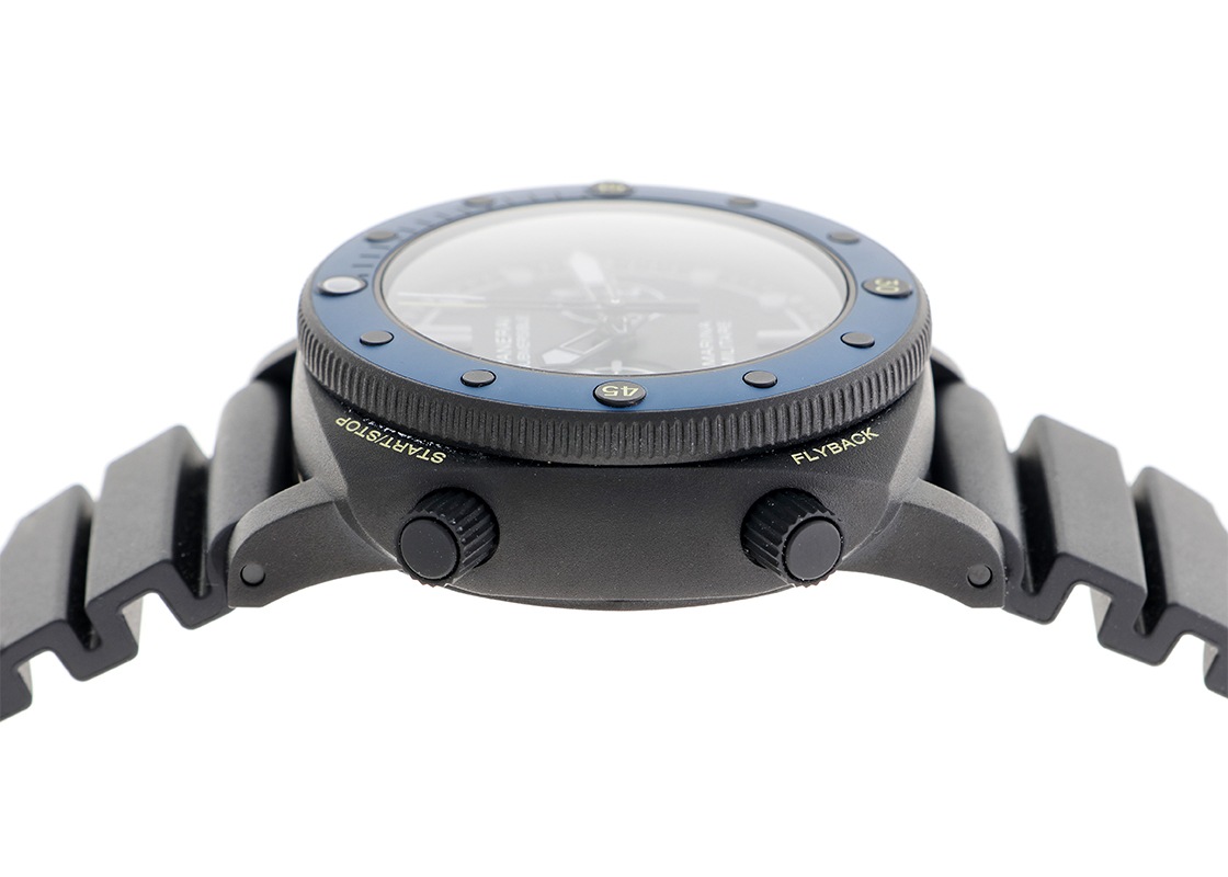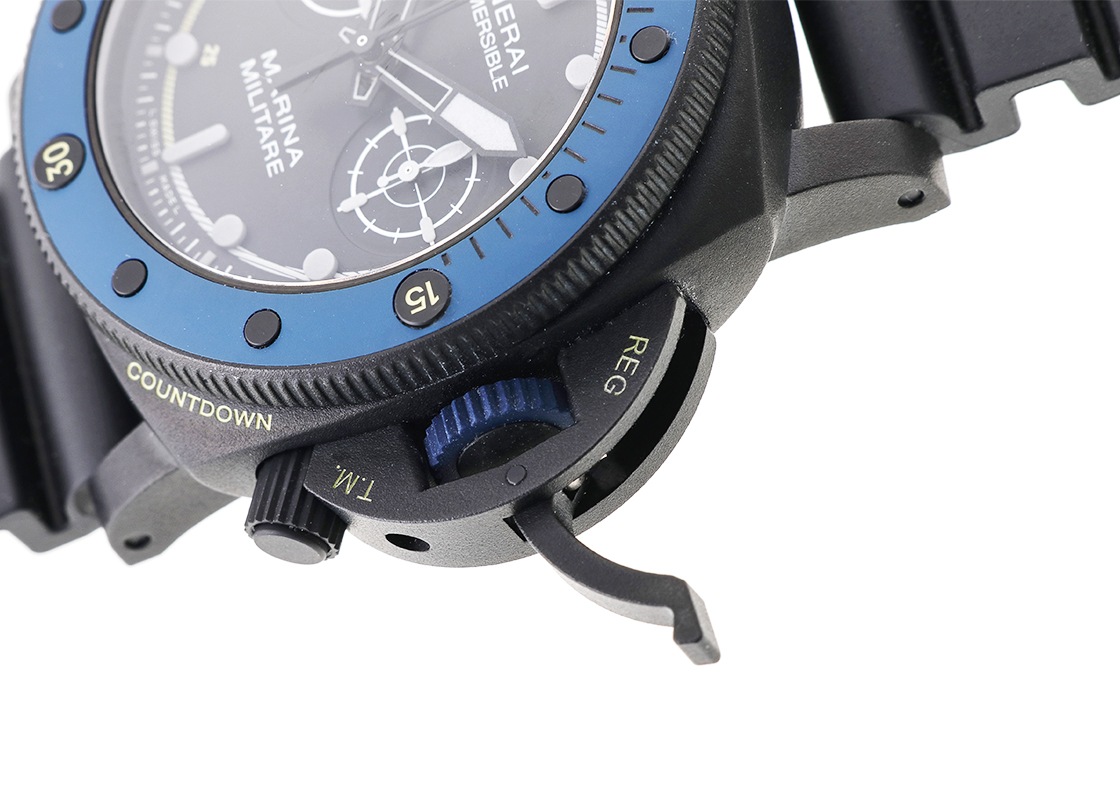 オフィチーネパネライより「サブマーシブル フォルツスペシャリ」が入荷しました。 サブマーシプルは、1956年にエジプト海軍向けに開発されたケース径60mmの大型軍用時計の「エジツィアーノ」が起源で、特徴的な逆回転防止ベゼルを継承しています。 こちらは、2022年に登場したイタリアの特殊部隊に敬意を表したモデルです。 モデル名の「フォルツスペシャリ」は、特殊部隊を意味します。 パネライブティック限定品で生産本数はわずか300本と希少です。 ケースはチタンにDLC処理が施され、ベゼルにはブルーセラミックが採用されています。 ムーブメントには、フライバック機能を持つキャリバー9100/Rが搭載されています。 ツインバレルを持つパネライ自社製のキャリバー9000ベースとなっているため、3日間のパワーリザーブに加え、時間調整の際に便利なゼロリセットセコンドが付いており、リューズを2段階引き出すと秒針が瞬時に帰零して停止します。 また、時針を1時間刻みで調整することも可能です。 キャリバー名のRはレガッタ・カウントダウンを意味し、4時位置のボタンを押すことによって分単位を表す積算計が1目盛り逆進します。 その状態でクロノグラフを始動させることによって分単位のカウントダウンを行うことが出来ます。 ヨットレース(レガッタ)に参戦するパネライらしいユニークな機能です。 2024年12月に販売がされた商品で、状態は未使用です。 現在、ブティックにて販売されている個体と同じ最新の品番です。 パネライの箱、保証書が付属します。 パネライの延長保証登録が済んでおり、保証は2032年12月まで有効ですので、よりご安心してご使用いただけます。 さらに詳しい内容を確認されたい方は、お気軽にお問い合せください。 管理用:owp601