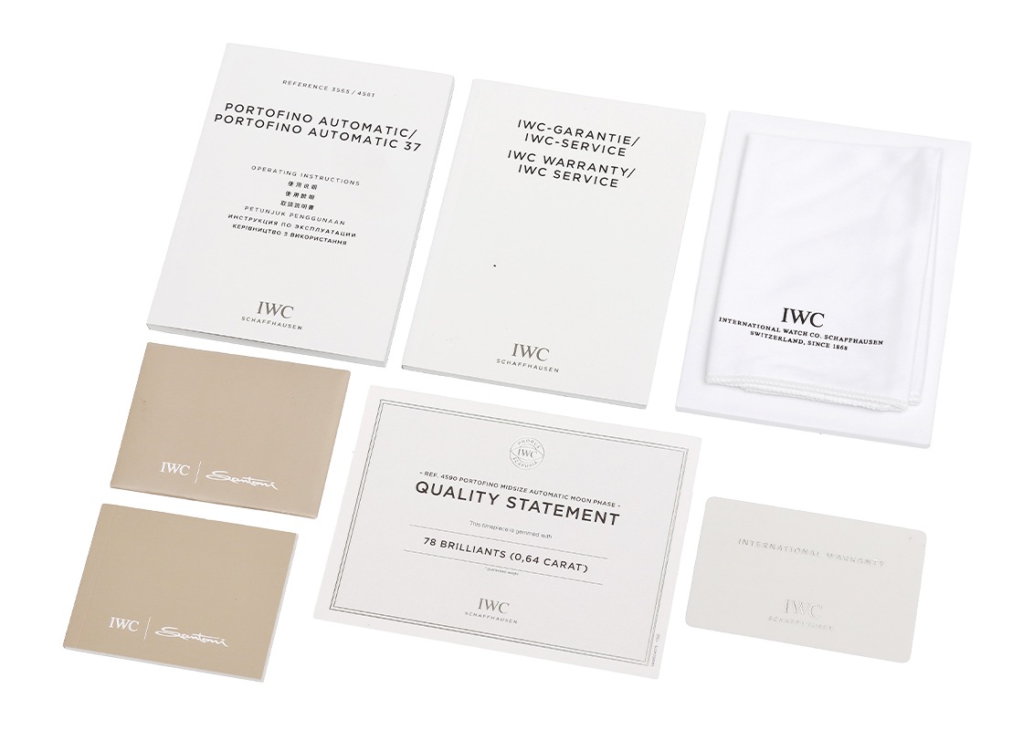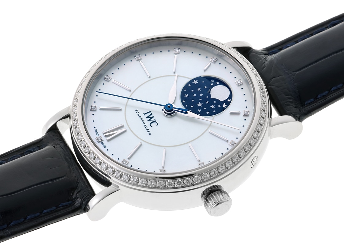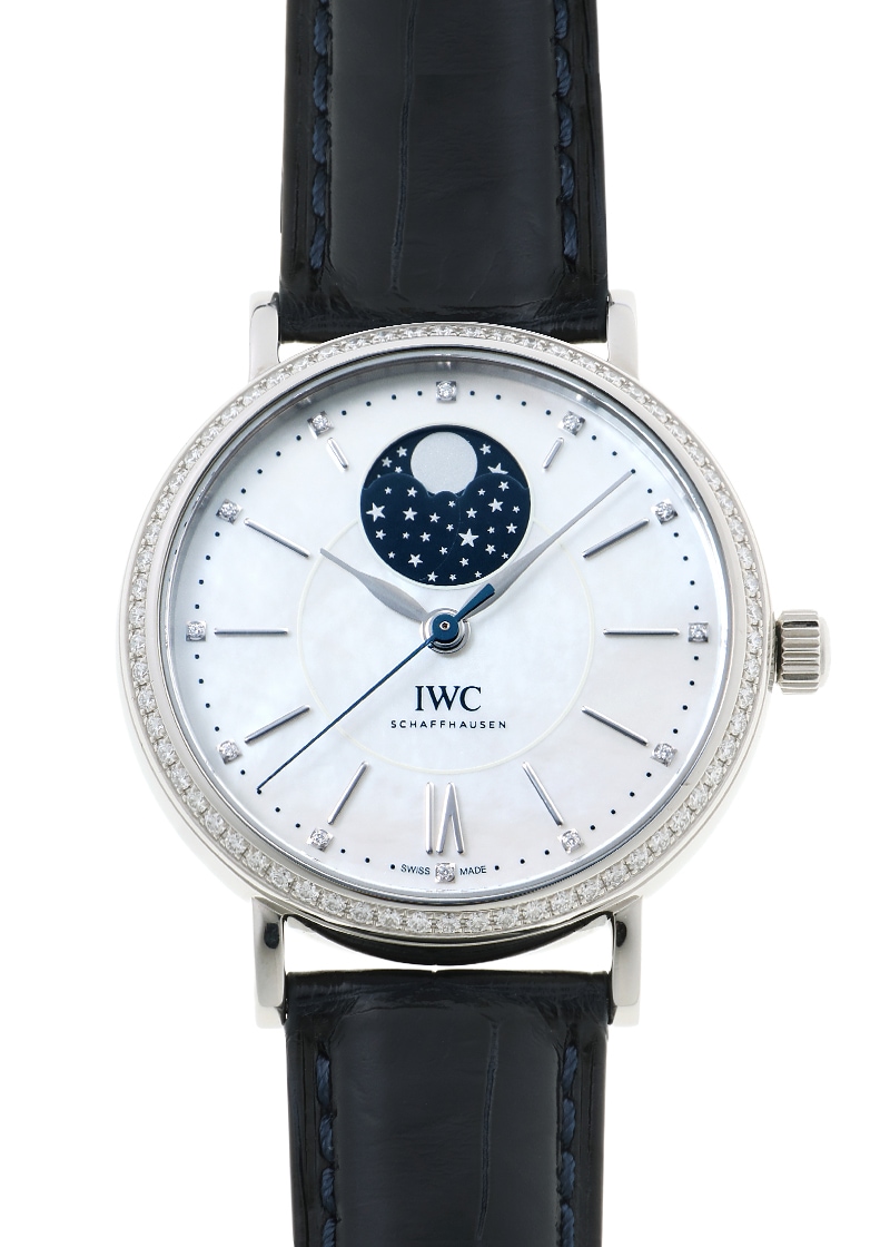 名門IWCより「ポートフィノ ムーンフェイズ ベゼルダイヤ」が入荷しました。 北イタリアの小島の先端に静かに佇む「ポルトフィーノ」は、言わずと知れた高級リゾート地です。 全体的に丸みを帯びたデザインはケースラインやリーフ針、アップライトインデックスなど各所に散りばめられ、優しい輝きが魅力です。 こちらは2014年に登場した、ダイヤモンドとマザーオブパールの輝きが美しく、 文字盤の12時位置にムーンフェイズ機構を搭載した、エレガントなポートフィノです。 37mm径のステンレススティール製のケースは、ベゼル部分に66個・時刻を表すインデックスの端に12個、 合計78個のダイヤモンドが腕元を華やかに飾ります。 文字盤のマザーオブパールは光の角度によって虹色に輝き、 醸しだされる唯一無二の表情は、時計の持つ魅力を一段と引き上げています。 また、毎日少しずつ変化していく月の満ち欠けを表すムーンフェイズの動きも、 ポートフィノの持つゆったりとした風格と親和性があります。 オンでもオフでも腕に馴染む時計で、バカンスやご旅行のお共にオススメの一本です。 搭載されるムーブメントはキャリバー 35800で、パワーリザーブは約42時間です。 提携工房にてオーバーホール(分解掃除)と外装の傷取り(研磨)が完了しております。 一部ガラスに線キズがございますが、視認性に大きな問題はなくお使いいただける程度です。 ストラップは新品のカシス製アリゲーターベルトを取付けています。 IWCの保証書(2016年9月)が付属し、別途当店のオリジナル携帯ケースをお付けします。 さらに詳しい内容を確認されたい方は、お気軽にお問い合せください。 管理用:owp540