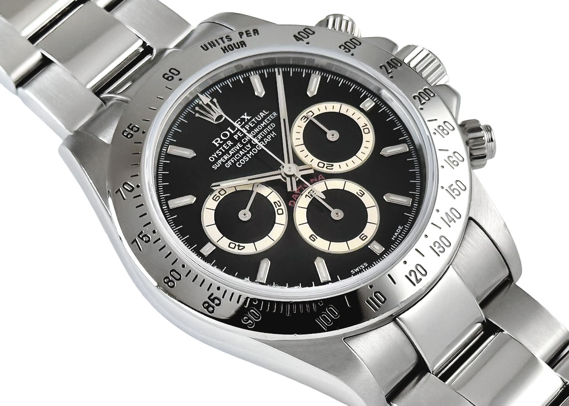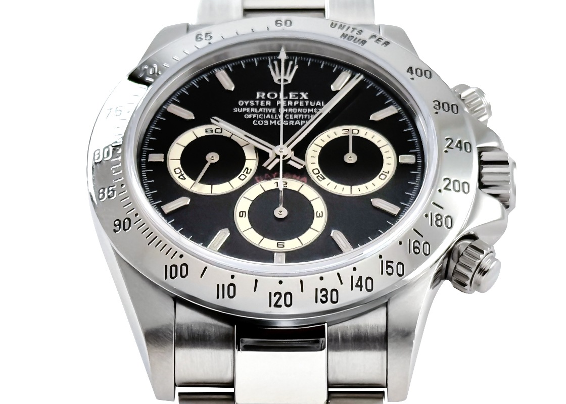 人気の5桁リファレンス「16520 コスモグラフ デイトナ」が入荷しました。 ゼニスの傑作クロノムーブメント「エル・プリメロ」を搭載。もともと毎時36,000振動だった同機を毎時28,800振動まで抑え、テンプを大きくしマイクロステラナットで精度を高めるといったロレックス独自の改良が施されています。 固有番号はA3番台、1998~1999年製造。 ブレスレットは一体型 78390A、SWISS MADE表記のルミノバ夜光、腕周りが約19.0cmまで対応可能です。 ほどよくエイジングしたクロノグラフカウンターが雰囲気の良い個体です。 商品状態として、当店入荷後に日本ロレックスにて分解掃除(オーバーホール)、外装仕上げを行っております。 ガラス淵、ベゼルに使用傷がございますが、2027年4月までロレックスの保証がございますので安心してご使用いただけます。 付属品は日本ロレックス修理明細書、当店オリジナルケースをお付けいたします。 さらに詳しい内容を確認されたい方は、お気軽にお問い合せ下さい。 管理用:owp913