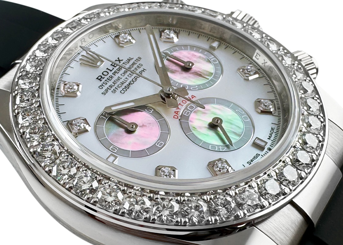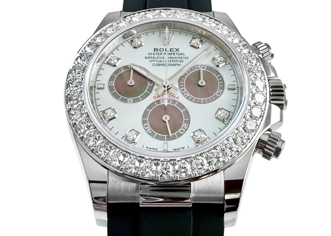 ロレックスのなかでも絶大な人気を誇るオイスターパーペチュアル コスモグラフデイトナより、「126589RBR」が入荷しました。 デイトナマラソンという言葉があるとおり、極めて入手困難なことで知られるデイトナ。 今回入荷したのは2024年に発表されたラインアップで、文字盤のホワイトシェルに対してインダイヤルのブラックシェルがアクセントとなったパンダモデル。 デザインとしてツートンカラーのモデルは数多くありますが、当該モデルはなんとカラーの異なるマザーオブパールを文字盤全体にあしらっており、波打った真珠層は見惚れるほどの美しさです。 ベゼルに配された36個のブリリアントカットダイアモンドの輝きがより一層ラグジュアリーな雰囲気を纏い、持つ人のステータスを格上げしてくれます。 ムーブメントにはロレックスの完全自社開発Cal.4131が搭載されており、高い伝達効率により約72時間のパワーリザーブを誇ります。 ムーブメントにはロレックス・コート・ド・ジュネーヴが施されており、見えないところにも手の込んだ作りとなっています。 また、衝撃や温度変化に高い耐久性を発揮するパラクロム・ヘアスプリングが採用され、高い信頼性と精度を実現しています。 さらに詳しい内容を確認されたい方は、お気軽にお問い合せ下さい。 管理用:owp685
