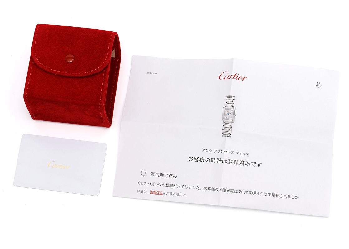 カルティエの定番シリーズ タンクから、「タンク フランセーズ SM」が入荷しました。 一番初めに腕時計を作ったカルティエが、タンクシリーズを初めてデザインしたのが1916年。 戦車を上から見た様子にインスピレーションを受けたタンクは、ラグと一体化した並行に伸びる縦枠が特徴のカルティエを代表するシリーズで、フランセーズをはじめ多くの派生モデルがあります。 タンクフランセーズは1997年発表で四半世紀にわたり発表時のまま展開されてきた人気モデルですが、2023年に初のモデルチェンジが行われ、その新型モデルが入荷しました。 変更点は多岐にわたり、全体的に少し大きく、エッジの効いた骨太な印象となり、ユニセックスとしての仕様を意識した雰囲気となりました。 特徴であるケースとブレスレットの作り込まれた構造も進化。 タンクの特徴である直線的なアールデコ調を軸に、平行な直線と斜めのカットを巧みに利用したデザインは変わらず、ベゼルが太く、ブレスレットも軸が太くなり華奢な印象を与えていた駒のカット部分を無くすことでよりしっかりとした作りに。 それでいてポリッシュ仕上げの光沢をプラスすることで華やかさをプラス。 さらに ホワイト文字盤からサテン仕上げのシルバーへ変更、インデックスは立体的なポリッシュ仕上げで角度によって見え方が異なり非常に高級感があります。 現行品番「WSTA0129」との相違点は、裏蓋のネジ山形状の変更のみです。 外観デザインおよびムーブメントの仕様につきましては、いずれも同一です。 提携工房にて外観の傷取り(研磨)を行っております。 ブレスレットの駒はすべて揃っており、腕周りは約15.5cmの方まで対応します。 2023年3月に販売された商品でカルティエの保証書が付属します。 延長保証の登録が完了しており、2031年3月上旬までカルティエの保証が有効でよりご安心いただけます。 さらに詳しい内容を確認されたい方は、お気軽にお問い合せください。 管理用:owq293