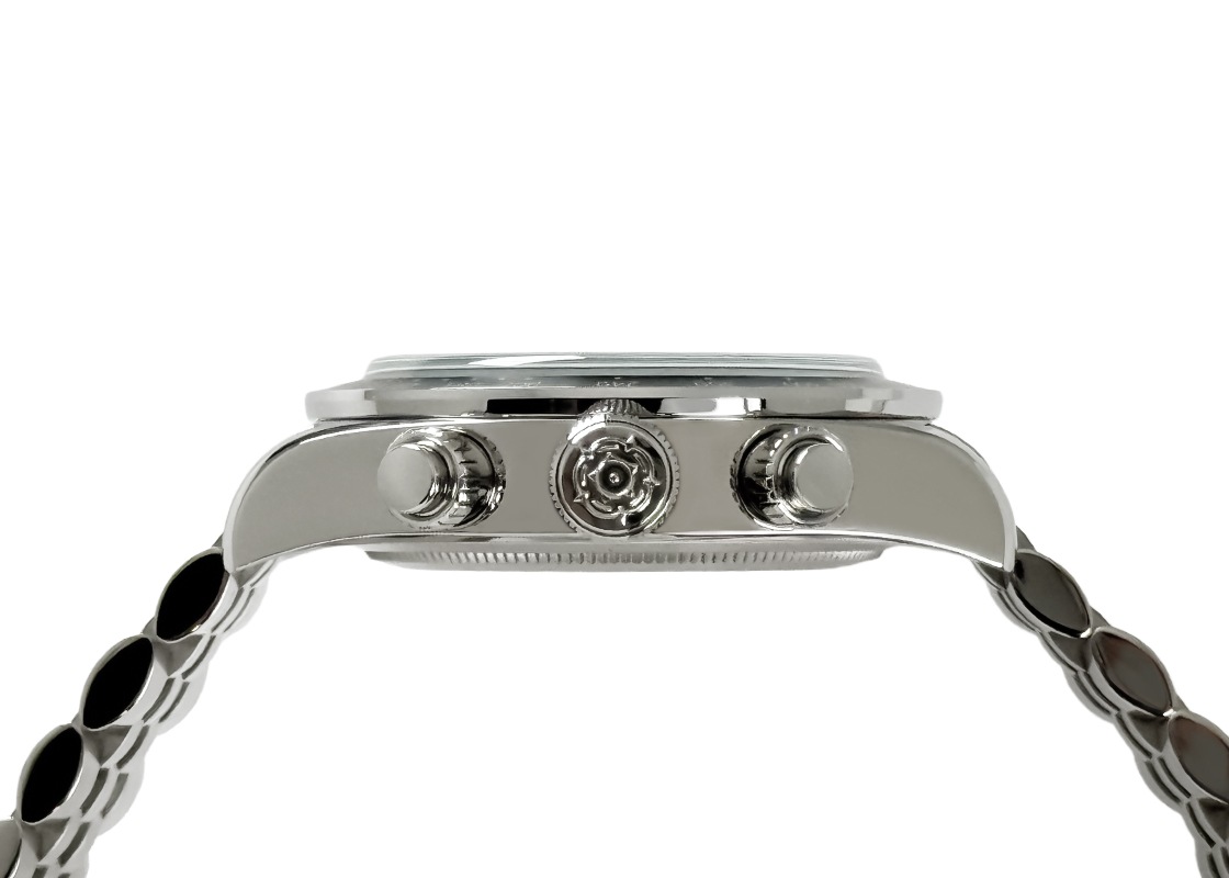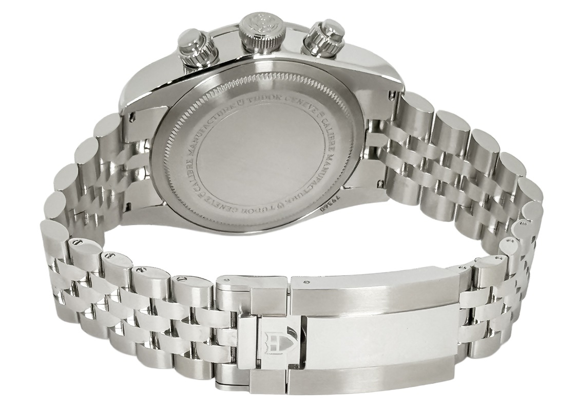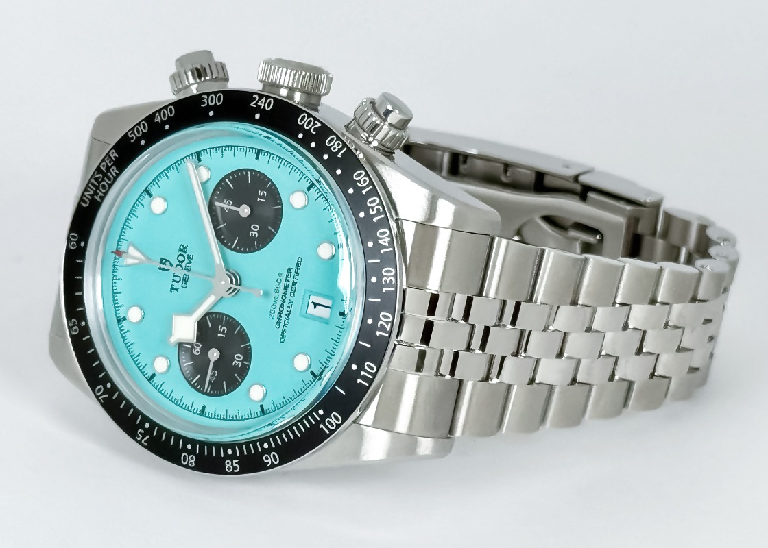 2025年の話題作ブラックベイクロノ「フラミンゴブルー」が入荷しました。 ロレックスの創業者ハンス・ウイルスドルフによって1926年に設立されたチューダーは、ロレックスの品質と信頼性を継承しつつ、より多くの人々が手にしやすい価格帯で高品質な時計を提供し続けています。 ブランドを筆頭する人気コレクションのブラックベイより、昨年発表されたフラミンゴピンクに続いて鮮烈な個性を放つ「ターコイズ」は、ブランド理念である「挑戦者の精神(Born To Dare)」を体現する大胆なカラーチョイスが最大の魅力です。 一般的なブルーとは一線を画し、フラミンゴが集まる熱帯の水辺を連想させながらも暖かみのある独特なトーンが特徴です。 文字盤のマットな質感とアルマイト加工されたブラックのクロノグラフカウンターとの確かなコントラストが視認性を確保しつつ、全体のバランスを引き締めています。 中央部分が細やかな5連のブレスレットはポリッシュ&サテン仕上げでドレッシ―な装いにもご愛用いただけます。 チューダー独自の“T-fit”クイックアジャストクラスプを採用し、工具を使わずにブレスレットの長さを5段階、計8mm伸縮可能です。 自社製ムーブメントのクロノグラフ機能を備えたCal.MT5813が搭載され、約70時間のパワーリザーブを備えているので実用性も折り紙つきです。 商品状態は、ブレスレット調整済みの未使用品で99%コンディションです。 付属品は、箱・保証書(2025年7月)がございます。 さらに詳しい内容を確認されたい方は、お気軽にお問い合せ下さい。 管理用:owp332