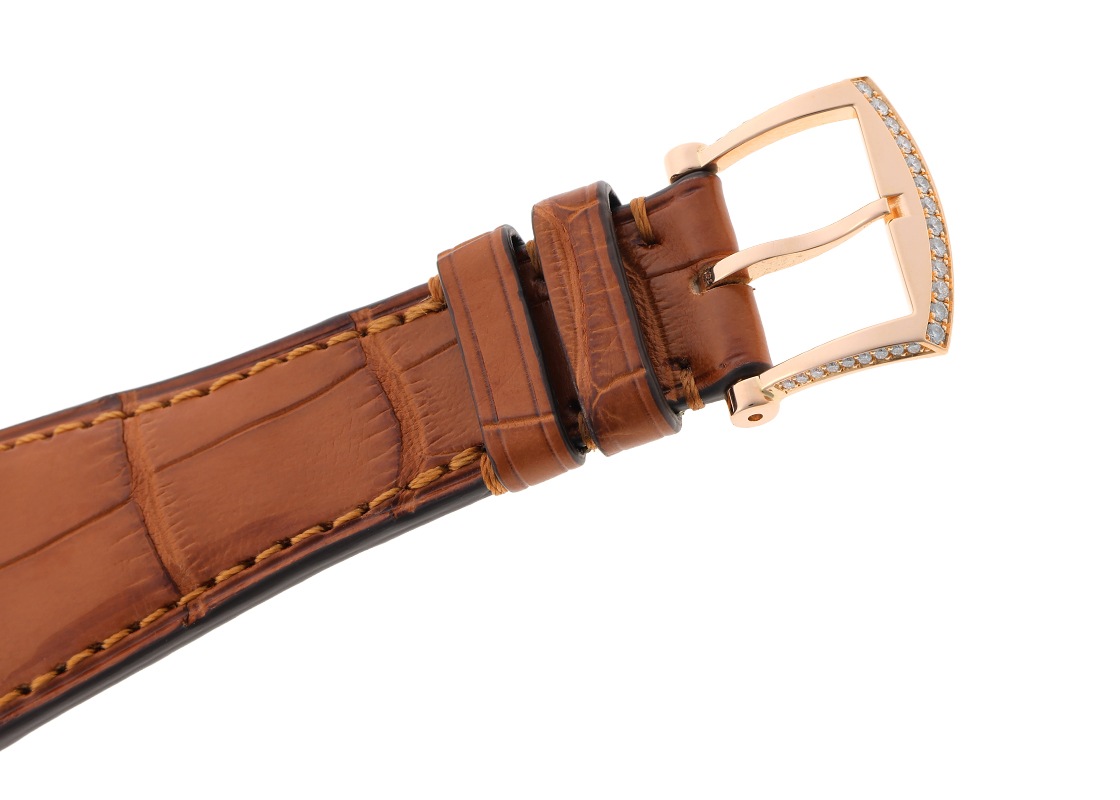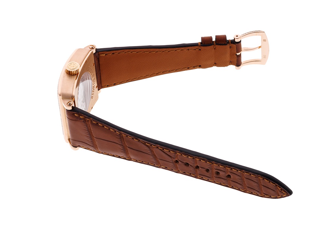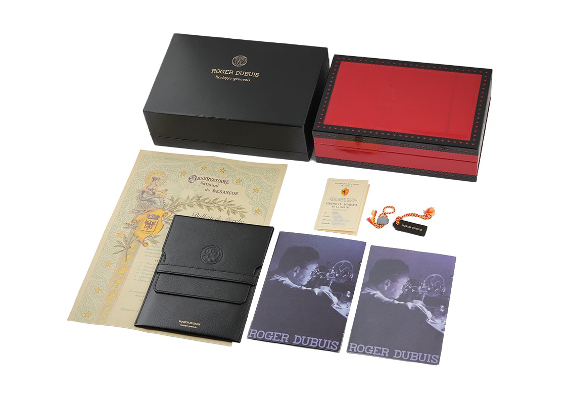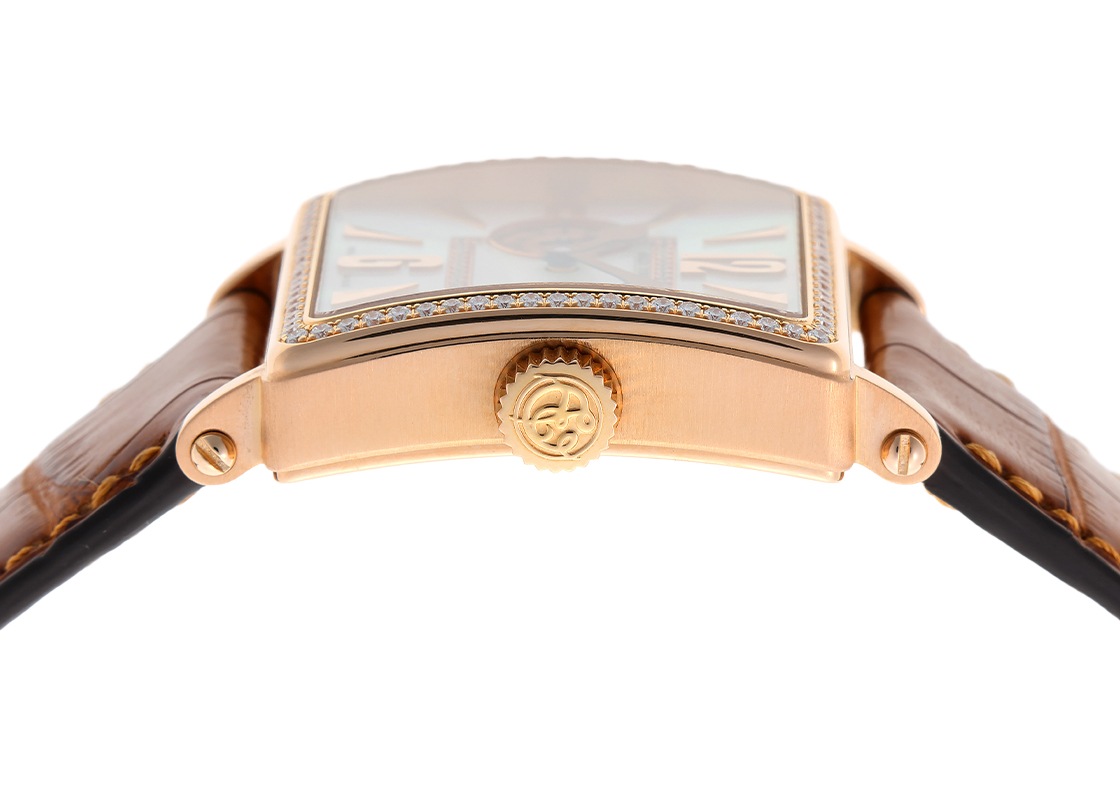 ロジェデュブイのゴールデンスクエア ベゼルダイヤ 34mmが入荷しました。 クラシカルなイメージのあるスクエアケースにロジェデュブイの手が加わり、エッジの効いた大胆かつファッション性の高いモデルです。 ケースはしっかりとした立ち上がりで存在感があります。 シェル文字盤の中央にはダイヤモンドと美しいギョーシェ彫りが施されています。 大きさは縦横が34mmです。 スケルトンのケースバックはジュネーブシールを取得した自社キャリバーを堪能できます。 このスタイルのゴールデンスクエアは、生産本数が28本と非常に少ないモデルのため中古品の流通は稀です。 提携工房にてオーバーホール(機械の分解掃除)、外装の傷取り(研磨)が完了しています。 ストラップは当店オリジナルのクロコダイルベルトを取り付けました。 裏蓋は形状の変形を抑えるため、研磨を最小限に抑えており僅かに傷が残っております。 ロジェデュブイの箱と保証書(無記入)が付属します。 さらに詳しい内容を確認されたい方はお気軽にお問い合せください。 管理用:owq441