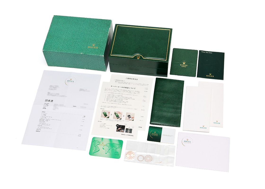 ロレックスのハイクラスモデル、「オイスター パーペチュアル デイデイト」が入荷しました。 1956年発表、日付と共に“フルスペル”で曜日を表示する初の時計だったデイデイトは、ロレックスの中でも最上位クラスのモデルとして貴金属素材のみで展開されています。 様々なバリエーションが存在するのも嬉しいポイントですが、こちらは2001年の登場から2005年にエバーローズ素材が発表されるまでの短い期間のみ製造されたピンクゴールド製の希少なモデルです。 上品さと高級感を蓄えた光を放ち、引き込まれるような魅力を感じさせます。 デイデイトはこれから先も愛され続けるハイクラスのラインです。 モデル番号は118205、固有番号はP番です。 ムーブメントはデイデイト専用に製造されたCal.3155を搭載。パワーリザーブは48時間。 バックルは旧タイプ仕様です。 日本ロレックスにてオーバーホール(機械の分解掃除)と外観の傷取り(研磨)に加え、ガラス・リューズ・文字盤・日付表示板・針の交換が完了しています。 腕周りは約18cmの方まで対応します。 付属品は、箱、修理明細書、取扱説明書、交換前の文字盤(ピンク/10Pダイヤモンド)・日付表示板・針がございます。 ロレックスの修理保証期間が2028年3月まで有効ですので、よりご安心してお使いいただけます。 さらに詳しい内容を確認されたい方は、お気軽にお問い合せ下さい。 管理用:owq744