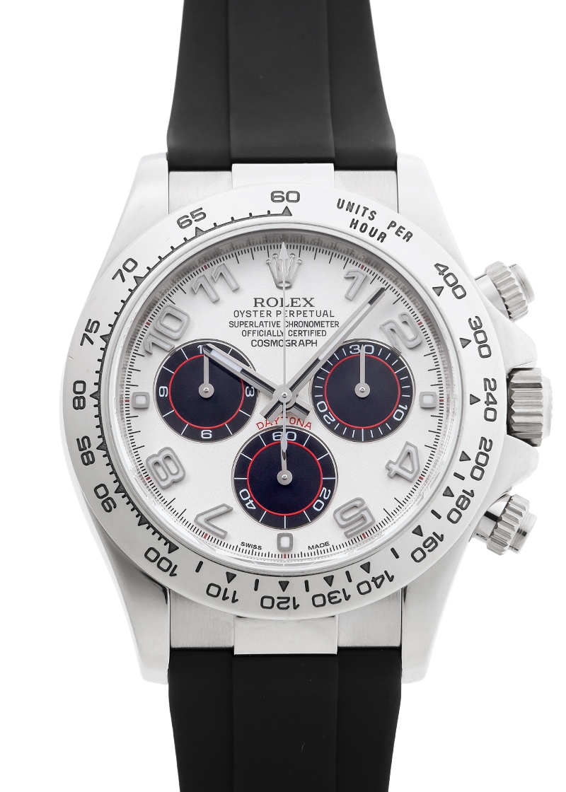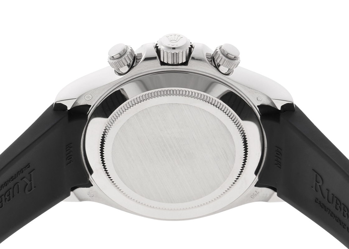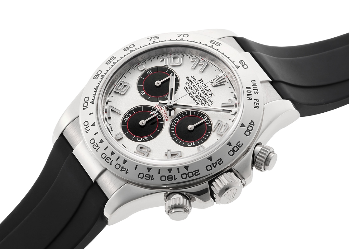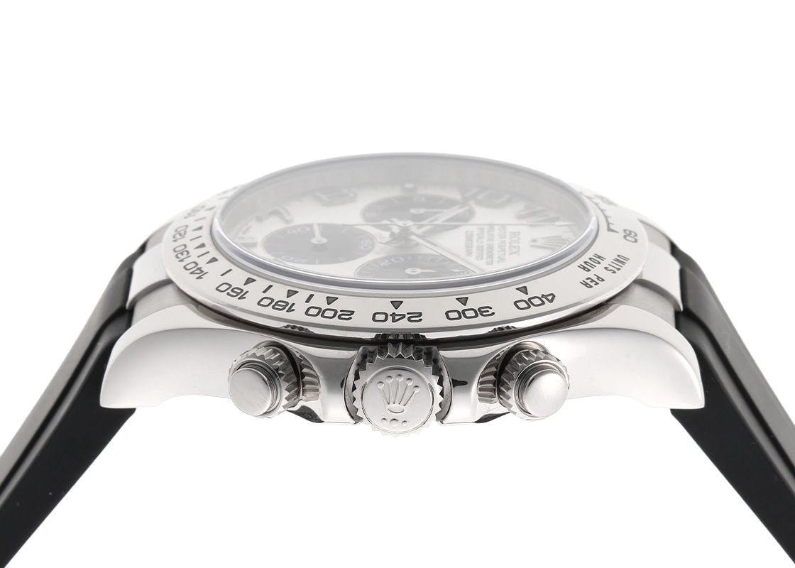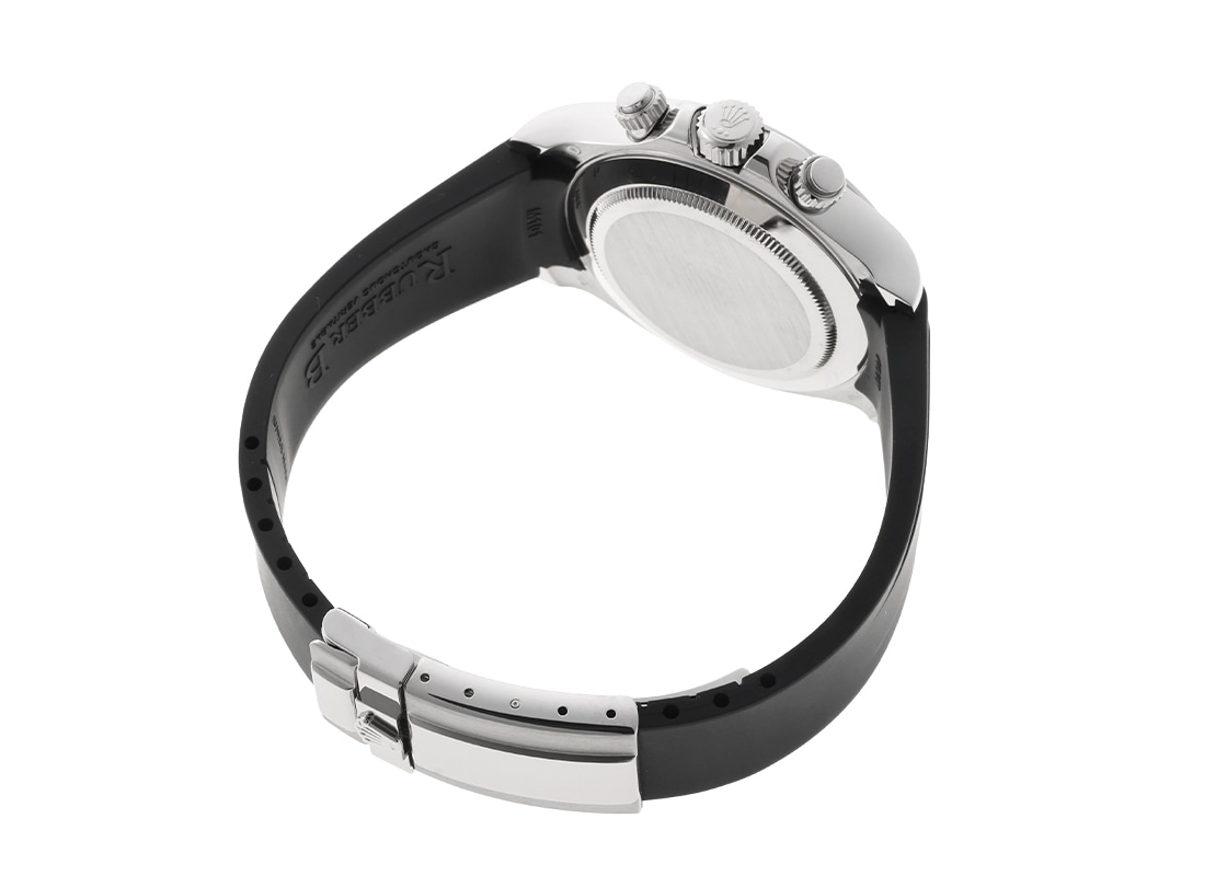 ロレックスより「オイスター パーペチュアル コスモグラフ デイトナ」が入荷いたしました。 こちらは、Ref.116519。ホワイトゴールド製のケースに、白文字盤をベースに黒のインダイアルを配した人気のパンダ文字盤です。 2017年にオイスターフレックスモデルの発表により生産終了となりましたが、未だに根強い人気を誇ります。 ムーブメントはRef.116520から搭載されているキャリバー4130を採用しており、約72時間のパワーリザーブを有します。 大ぶりなアラビアインデックスは視認性・デザイン性を高めており、レザーストラップはゴールド素材にしか設定されていない特別感を与えてくれます。 スポーツモデルでありながら、ドレスウォッチに通じる品格を備えており、ロレックスの技術と美意識が凝縮された、完成度の高い一本です。 商品状態は、ロレックスにてオーバーホール(機械の分解掃除)と外観の傷取り(研磨)、文字盤と針の交換、ベルトの新調が完了しております。 ロレックスの修理保証が2年間有効で、よりご安心してお使いいただけます。 M番の個体番号で付属品は、ロレックスの箱と保証書(2010年11月販売)、修理明細書、サービス保証書、交換前の文字盤(ブラックシェル/ローマ)と針、クロコダイルベルトがございます。 時計にはブラックラバー(Rubber Bモデル)ベルトを取り付けています。 さらに詳しい内容については、お気軽にお問い合わせください。 管理用:owp493ロレックス - オイスター パーペチュアル コスモグラフ デイトナ【ブラックシェル文字盤付】 | ROLEX | 116519NR | WG ホワイト/ブラック文字盤 自動巻き ラバー | 中古- 商品コード