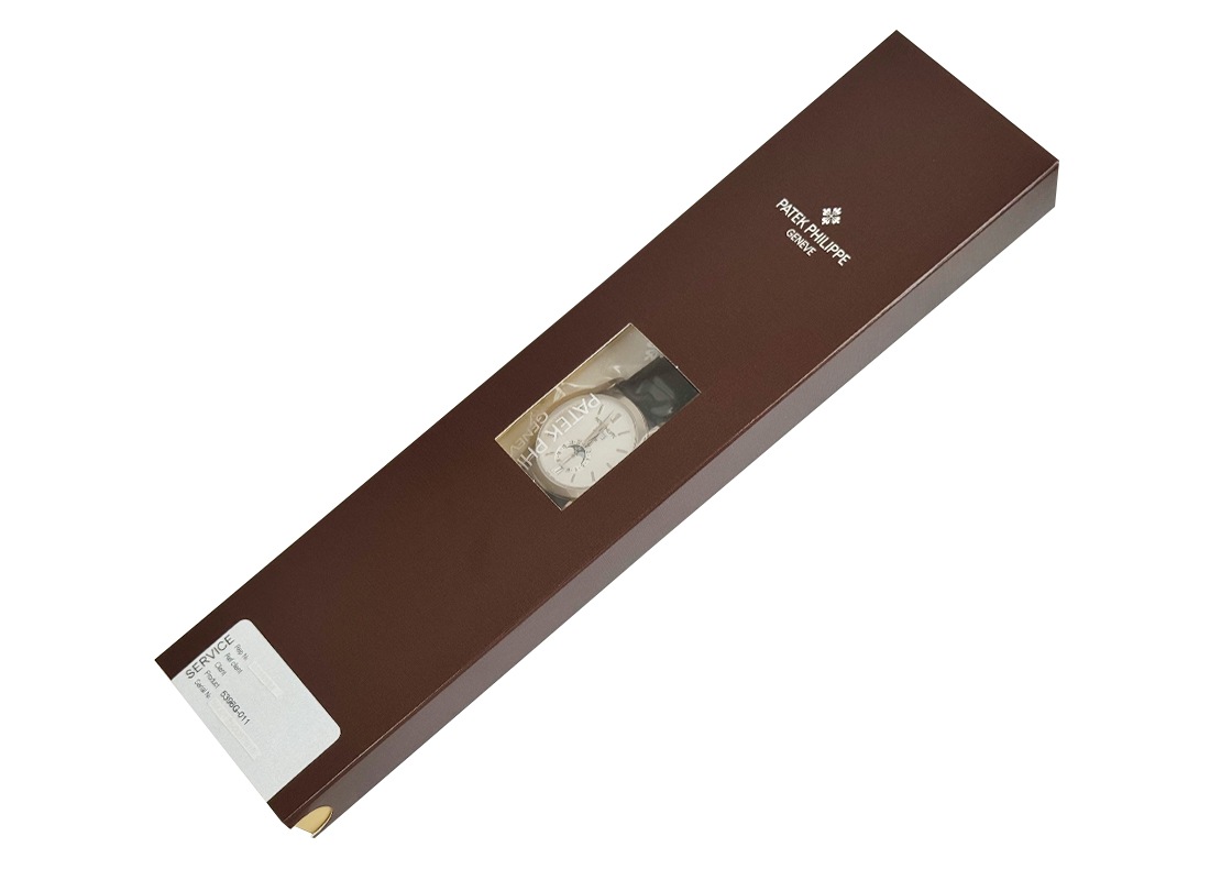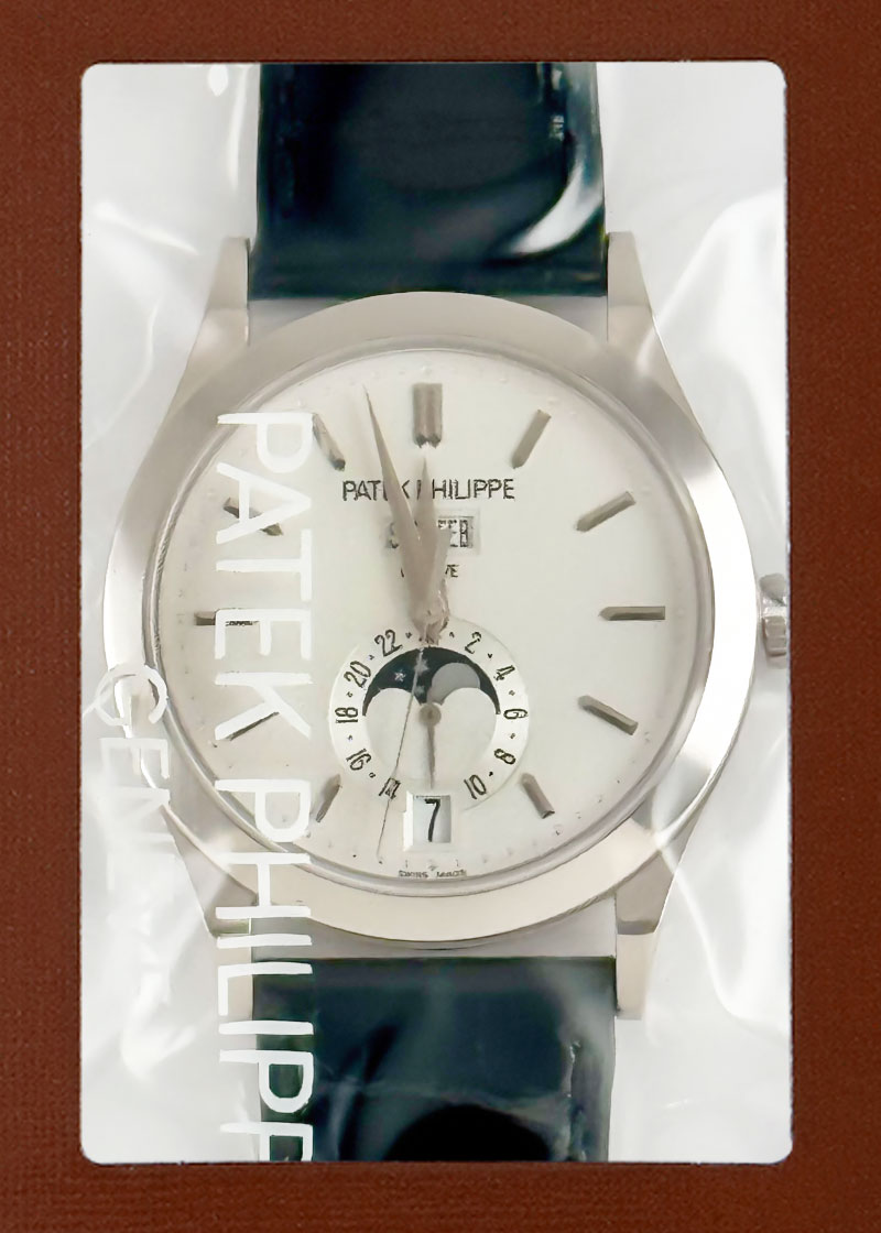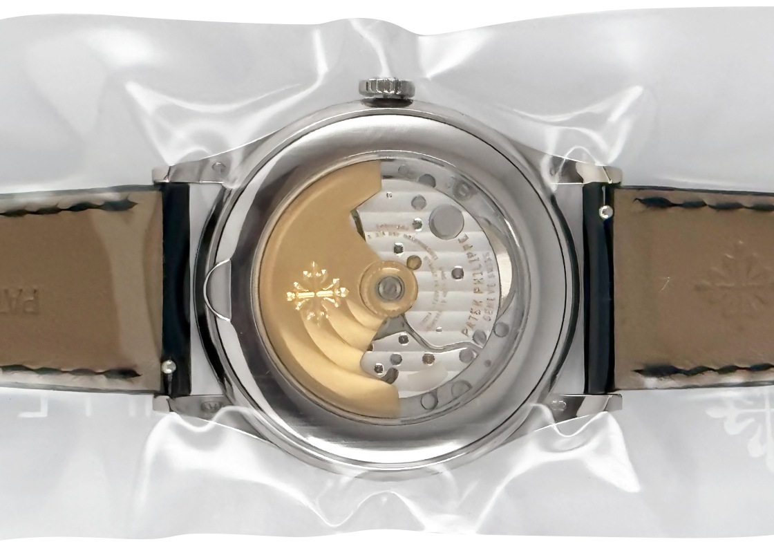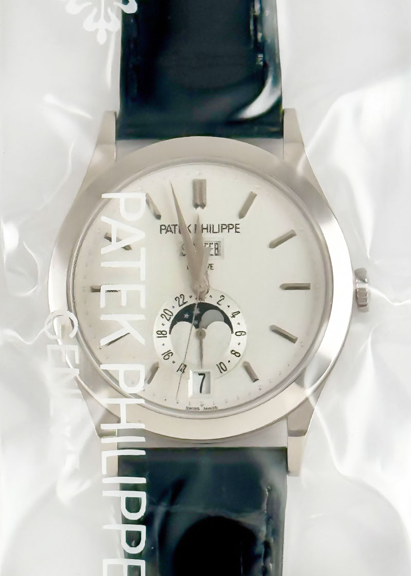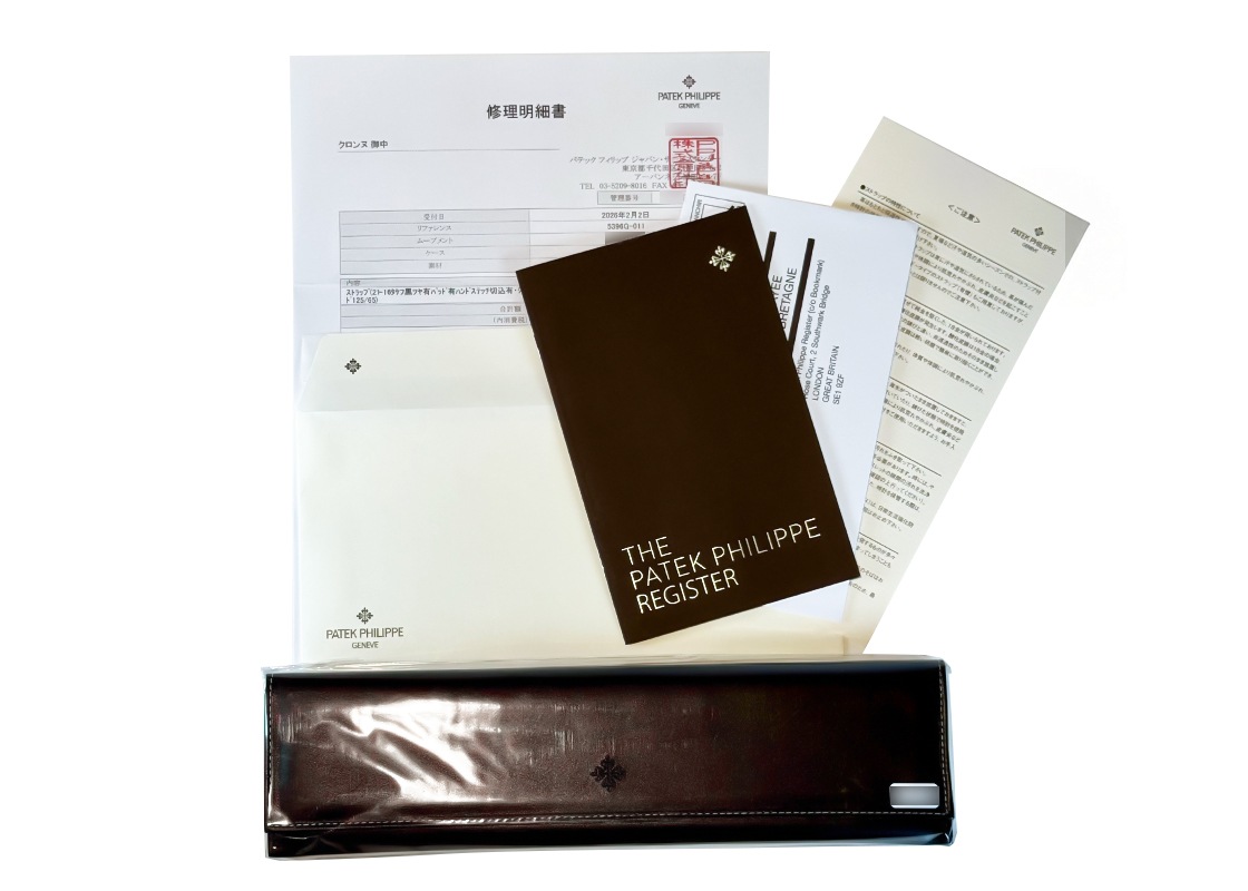 機械式時計の最高峰ブランド、パテック フィリップより、年次カレンダーとムーンフェイズを搭載した「5396G-011」が入荷いたしました。 年次カレンダーとは、30日・31日の月を自動で判別し、日付の調整を行う高機能カレンダー機構のこと。 調整が必要なのは、2月末から3月1日にかけての年に一度のみという実用性の高さが大きな魅力です。 本機構はパテック フィリップが1996年に開発し特許を取得した、同社を代表する革新的コンプリケーションです。 パテック フィリップの年次カレンダーモデルは、大きく分けて3つの表示パターンに分類されます。本モデルは、月と曜日を横並びの2ディスクで窓表示する「5396系」に属する一本。 整然と並んだ表示窓が、クラシカルで端正な印象を演出します。 年次カレンダーや永久カレンダー搭載モデルの中には、文字盤上の複数のインダイヤルを読み取る必要があるデザインも多く存在しますが、本モデルは日付・曜日・月をそれぞれ独立した窓で表示。 直感的に情報を把握できる高い視認性を実現しています。 さらに6時位置のムーンフェイズ外周には24時間表示を備え、昼夜の判別も可能。 伝統的な意匠の中に実用性と合理性を巧みに融合させた、完成度の高いレイアウトが魅力です。 この複雑機構を支えるのは、パテック フィリップ・シール認定の自社製ムーブメント「324 S QA LU 24H/303」。 21金製ローターを備えた自動巻き機構は巻き上げ効率にも優れ、精緻な仕上げと滑らかな動きをシースルーバック越しにご堪能いただけます。 ケース径は38.5mmとバランスに優れ、腕元にも自然に馴染むサイズ感。 パワーリザーブは最大約48時間を確保しており、実用性も十分です。 美観と機能性、そして技術力を高次元で両立した、まさにパテック フィリップならではの年次カレンダーモデル。長く愛用するにふさわしい、品格あふれる逸品です。 商品状態は、当店にてムーブメントの調整および、外装仕上げを実施。 また、パテックフィリップにて、新品のクロコダイルストラップに交換しています。 さらに詳しい内容を確認されたい方は、お気軽にお問い合せ下さい。 管理用:ia-191