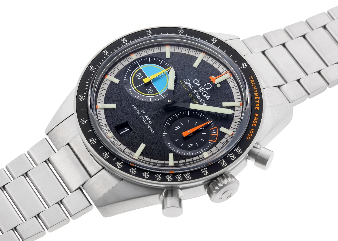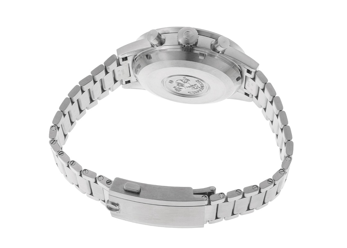 オメガの中で最も魅力あるエピソードを持つスピードマスターは、1957年に登場し現代まで愛される腕時計の定番モデルです。 こちらのモデルは、新世代のパイロットに向け2024年に登場した新作です。 文字盤は1969年から1976年に存在した「フライトマスター」をイメージさせます。 マットグレイン仕上げの文字盤には2つのインダイヤルが備えられます。 3時位置は積算計になっており、オレンジ色の針は分を表し、グレー色のさらに小さな針は時間を表します。 航空計器の燃料消費インジケーターを模したメモリが特徴的です。 また、9時位置のスモールセコンドは、パイロットに必要不可欠の人口水平器を彷彿とさせます。 タキメーターはファーストモデルと同じ表記になっており、細かなデザインにも遊び心がございます。 ムーブメントにはマスタークロノメーター規格に準拠したキャリバー9900が搭載されます。 マスタークロノメーターの名を持つモデルは、スイスクロノメーター検定協会(C.O.S.C)によるムーブメントのみの精度テストだけではなく、スイス連邦計量・認定局(METAS)にて組み立てられた状態で機械安定性、精度、防水性能、パワーリザーブ、耐磁性能のすべてのテストに合格したことを表します。 軟鉄製のインナーケースを使用せず、ムーブメント自体を非磁性にすることで15,000ガウスの耐磁性を誇ります。 ブレスレットの形状はテーパードとスマートで、ビジネスシーンでもお使いやすくなっております。 また、フォールディングクラスプは、エクステンションパーツで腕周りの微調整が可能です。 さらに詳しい内容を確認されたい方は、お気軽にお問い合せください。 管理用:owq790