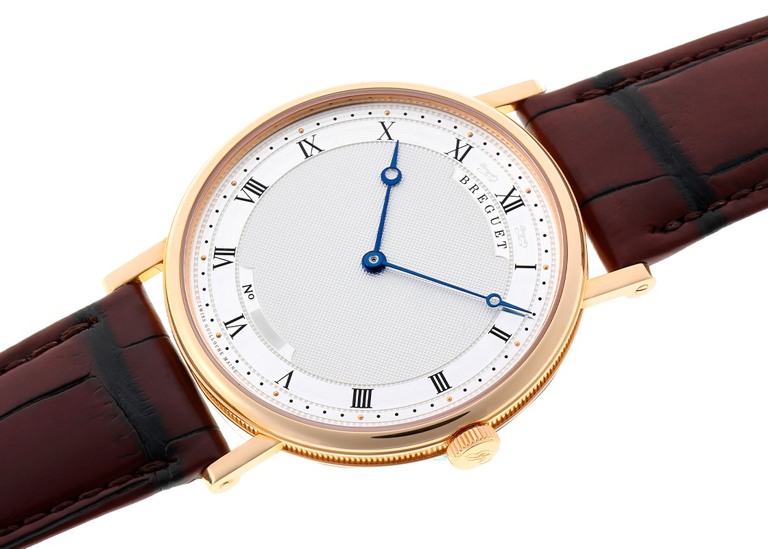 ブレゲより「クラシック エクストラフラット」が入荷しました。 ブレゲの美と技が一体となったクラシックシリーズは、シンプルで無駄を省いたデザインと視認性の良さが特徴です。 こちらは2018年に登場したデイト表示もなくシンプルな2針モデルです。 自動巻きモデルですが、ケースの厚さはわずか5.4mmと薄型で38mmのケースと相まって手首に馴染む良いサイズです 文字盤の12時位置には本物のブレゲであること示す手彫りのシークレットサインが施されます。 また、なブルースティール針と手彫りギョーシェ模様の組み合わせが、精巧な装飾により上品な雰囲気をもたらします。 ムーブメントには、超薄型のキャリバー502.3が搭載され、仕上げにはペルラージュに加え、浅く仕上げた筋目が施されています。 筋目は光を当てることで虹色に輝き、高度な技術によって装飾されたことがわかります。 また、シリコン製ヒゲゼンマイとフリースプラングテンプを採用することで、磁気や衝撃に強い設計であり、オフセットしたローターと蓋の無い香箱が特殊です。 パワーリザーブは45時間です。 さらに詳しい内容を確認されたい方はお問い合わせください。 管理用:owq909